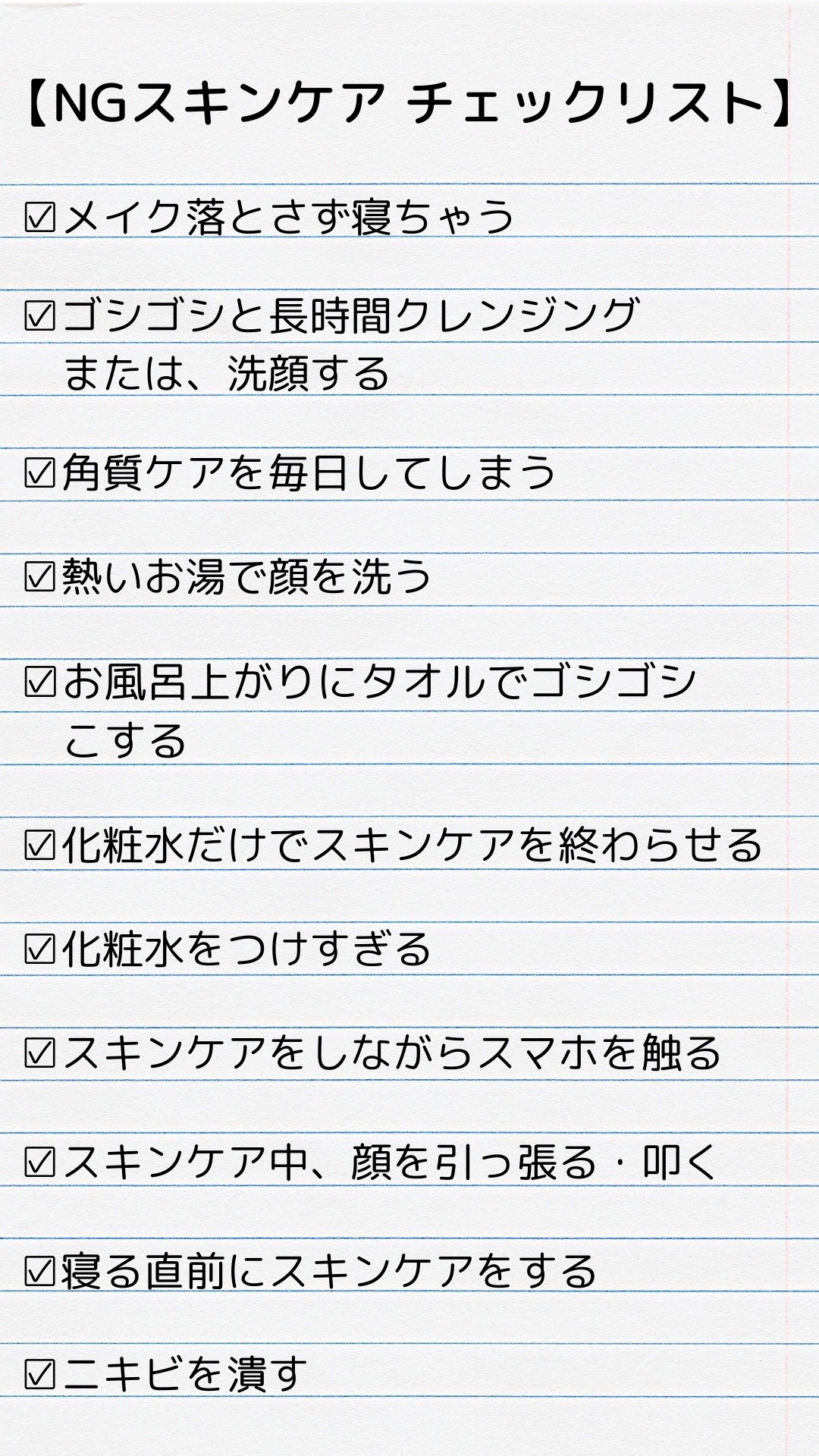 スキンケア、毎日なんとなくやっていませんか?実は、“良かれと思ってやってること”が肌トラブルの原因になっていることも…。今回は、知らずにやりがちなNGスキンケア行為をピックアップしてご紹介します!キャッチコピー&NG行為紹介\それ、実は逆効果かも!?/やりがちだけどNGなスキンケア行為5選☑︎メイク落とさず寝ちゃう→毛穴詰まりの原因No.1!肌も疲れてるから、ちゃんとオフしよう!☑︎ゴシゴシと長時間クレンジングまたは、洗顔する→摩擦は肌の大敵!汚れを落とすつもりが、乾燥や赤みの原因に。ふわふわの泡でやさしく包み込むように洗うのが正解◎☑︎角質ケアを毎日してしまう→やりすぎはNG!週1〜2回でOKです。☑︎熱いお湯で顔を洗う→気持ちはスッキリするけど、肌に必要なうるおいまで流れてしまいます。ぬるま湯(32〜34℃)で洗うのがベスト!☑︎お風呂上がりにタオルでゴシゴシこする→摩擦で肌バリアが壊れる原因に。やわらかいタオルか、顔専用拭き取りシートで“ポンポン”と皮膚にのっている水分を吸い取るのが正解!☑︎化粧水だけでスキンケアを終わらせる→水分だけでは保湿は不十分。乳液やクリームでフタをしないと、肌が乾いてしまいます。☑︎化粧水をつけすぎる→水分が多すぎると逆に乾燥しやすくなることも…。適量でOK!商品によって違いますが大体の適量は500円玉サイズが目安。☑︎スキンケアをしながらスマホを触る→画面の汚れが手について、肌に雑菌が…清潔な手で丁寧に!もしくは、スマホは消毒シートで拭いて常に清潔に!☑︎スキンケア中、顔を引っ張る・叩く→リフトアップには逆効果。“摩擦レス”が美肌ルール。☑︎寝る直前にスキンケアをする→ケア後すぐ寝ると、スキンケアが寝具に吸収されて台無し!☑︎ニキビを潰す→跡が残ったり、炎症が悪化する原因に!気になるときは皮膚科か、市販のスポットケアで対応を。肌はとっても繊細。毎日のケアの中にNG行為がないか、今一度チェックしてみてくださいね♪正しいスキンケアで、もっとキレイな私を目指しましょう!#スキンケア初心者#肌荒れ対策#垢抜け習慣#やりがちNG#美肌になりたい#スキンケアルーティン#自分磨き中