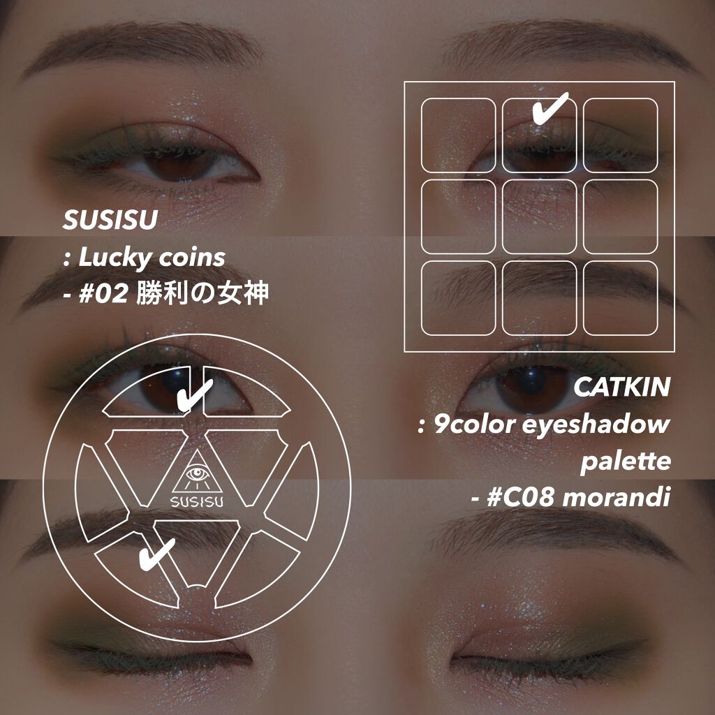 スモーキーなグリーンメイク✔︎☁️ITEM☁️【eyeshadow】✔︎CATKIN:9coloreyeshadowpalette-#C08morandi✔︎SUSISU:Luckycoins-#02勝利の女神【lip】✔︎NARS:powe...