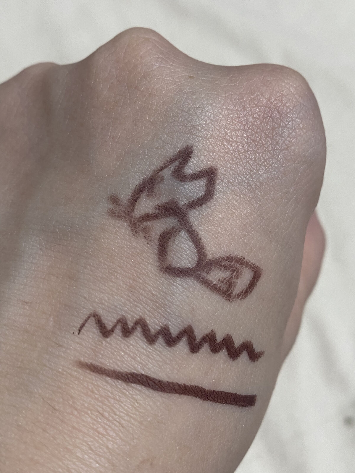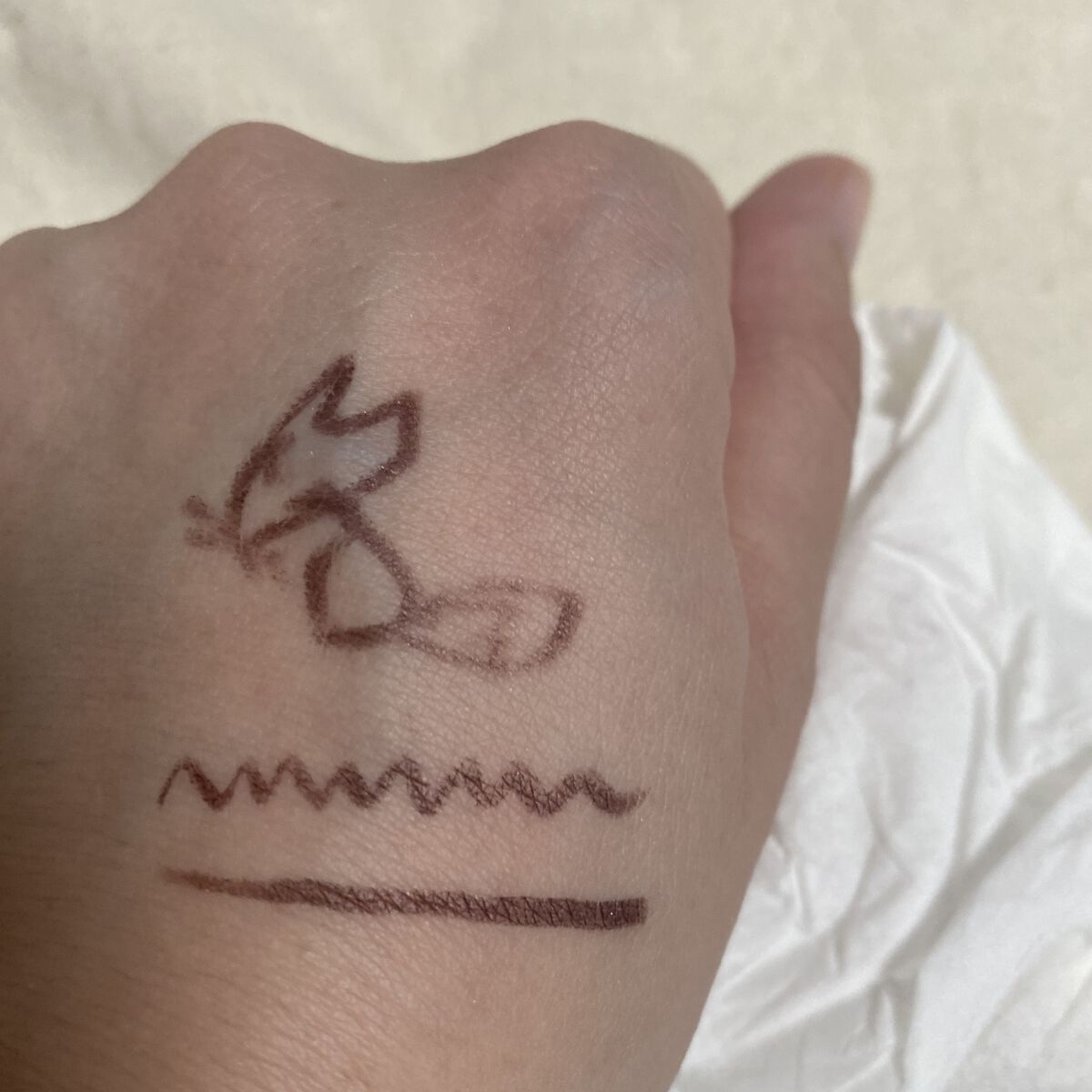 めちゃくちゃパケ買いなので、珍しくちゃんと外箱も取ってます🙆♀️ 色味は赤銅色なので、比較的どんなアイメイクにも合わせやすいです。絶妙な赤みブラウンがとても可愛いです。 軽い力でスルスルかけて、戻せないタイプの繰り出し式です。 擦れにも強く、ティッシュでゴシゴシ擦ってもびくともしません。 ただその代わりに、ウォータークレンジングでは少し落としきれませんでした。 書き心地といい、落ちにくさといい、キャンメイクのクリーミータッチライナーに近いものを感じます🤔