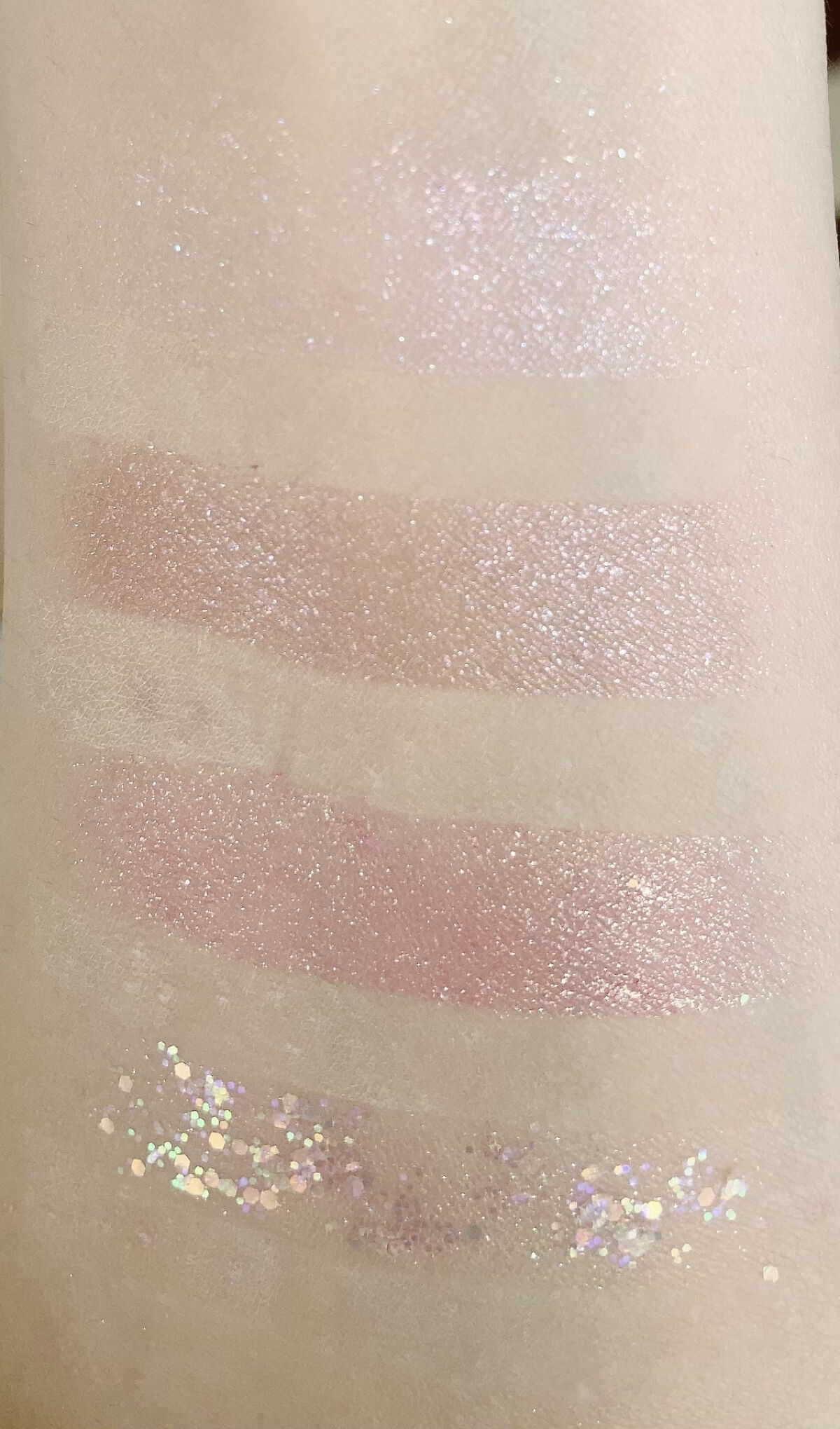 こんにちは初めてのアイシャドウスウォッチ挑戦日記です☺️アイシャドウって消耗品だけど、使ってる時のウキウキ感や微妙な色の記憶を残しておきたくて、自分の肌でスウォッチをやってみたくて居ても立っても居られず、やってみました!が、敏感肌なので腕にブツブツあるわ血管の青みはあるわで一度塗ったものを落として腕にファンデーションぬって撮り直したり実物の色味に近く見える場所を探したりマステの後が皺になったりとてんやわんやで2時間かかりました🤣🤣ただの初心者のぼやきですみません🙇♀️でも塗り塗りするの楽しい🤣LIPSみながら練習します💪肝心の商品です😂↓✼••┈┈••✼••┈┈••✼••┈┈••✼••┈┈••✼RICAFROSH ラグトーマス・キット01.サンフラミンゴ✼••┈┈••✼••┈┈••✼••┈┈••✼••┈┈••✼知り合いにいただいたもので、なかなか自分では選ばないブルベ寄りパレット💦なのですが、アイシャドウの絶妙なピンクブラウンのおかけで意外と活躍しています。スウォッチは自分がまぶたに塗ってる時くらいの薄さを心がけてつくったので、ガッツリ発色を知りたい方は他の方の投稿をご覧ください、、、結構使い込んでいるのと、不注意で落下させたさせたこともあるので実物のパレット汚いですすみません😂上段のアイシャドウ右から2番目の絶妙なピンクブラウン、写真だとブラウンみが強いですが角度によってピンク感がきらめいて綺麗です。わりと薄づきなので発色を求める方には物足りないでしょうか、、、3番目のピンクはしっかり発色します。私にはちょっと派手なので休日のお出かけ時に使ってます。落下して割れたので大変なことになってます😂下段のマットチークはパープル感が強いので使う時は服でブルベ感を意識してます。こちらも薄づきなので失敗は無くて良いです。アイブロウは右2色・左2色ずつ混ぜて使ってます。このパレットひとつでメイクが完成するので時間がない時などにも重宝しています!
