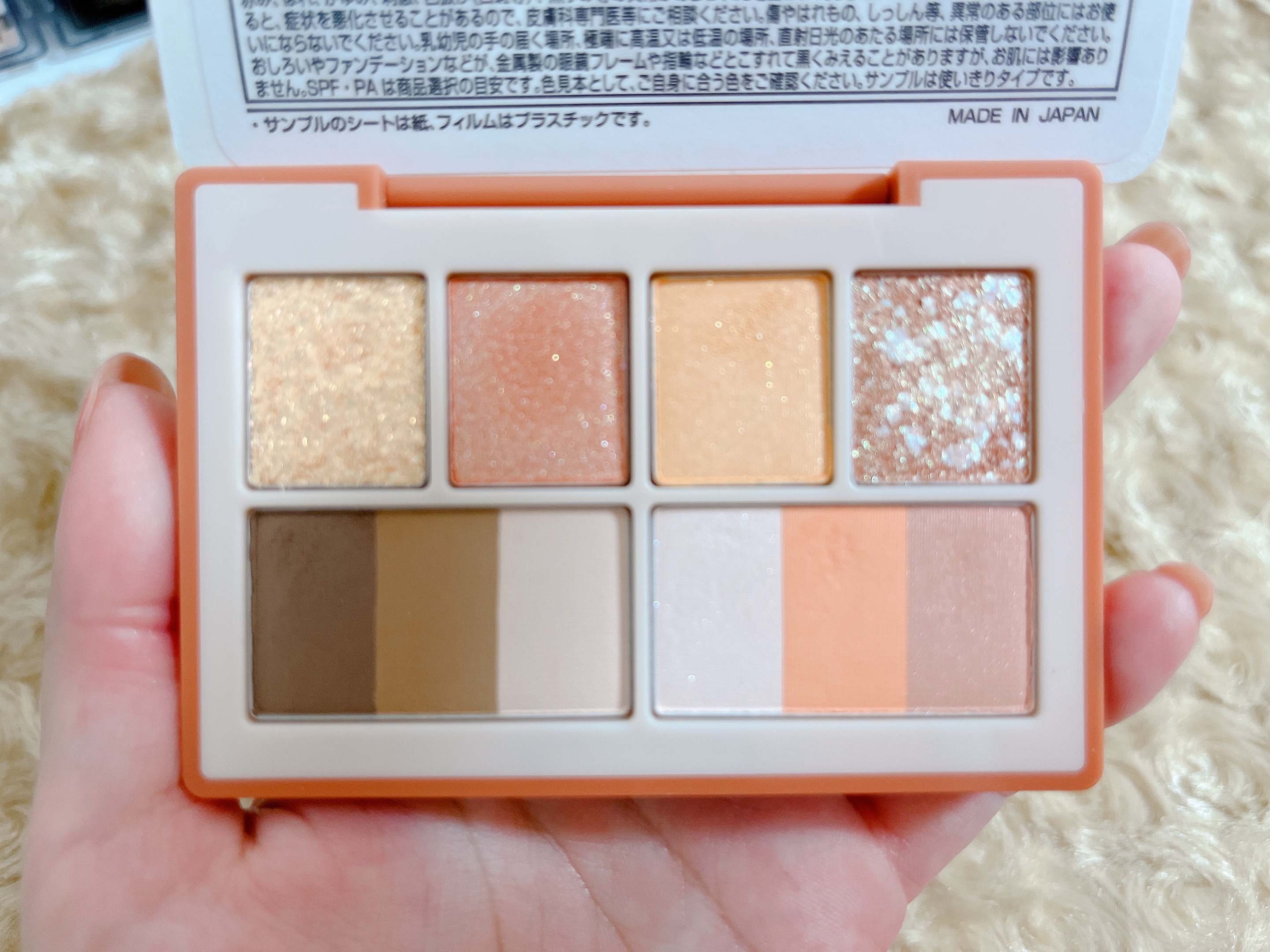 マルチパレット系は、これまで試したやつはあんまり個々のクオリティが高くないイメージだったんだけど、これはアイシャドウとしてもチークとしてもアイブロウとしても優秀。 オレンジ系カラーで統一されているから、メイク初心者の人におすすめしたいくらい! アイシャドウは右端のvintage?ってラメが韓国風のベタってくっつく感じでかわいい♡ チークはめっちゃ発色がいいので、普段のノリでいくとおてもやんになる笑 アイブロウ粉柔らかめでちょっとしっかり目の色。 そしてなんといっても大きい鏡が付いてるからどこにいても化粧しやすい! 私はこれにベースメイクとアイブロウブラシとハイライトとチークブラシとイニスフリーのちっちゃいマットシャドウと、アイライナー(マスカラも使えば)だけ持ってお出かけできる♡