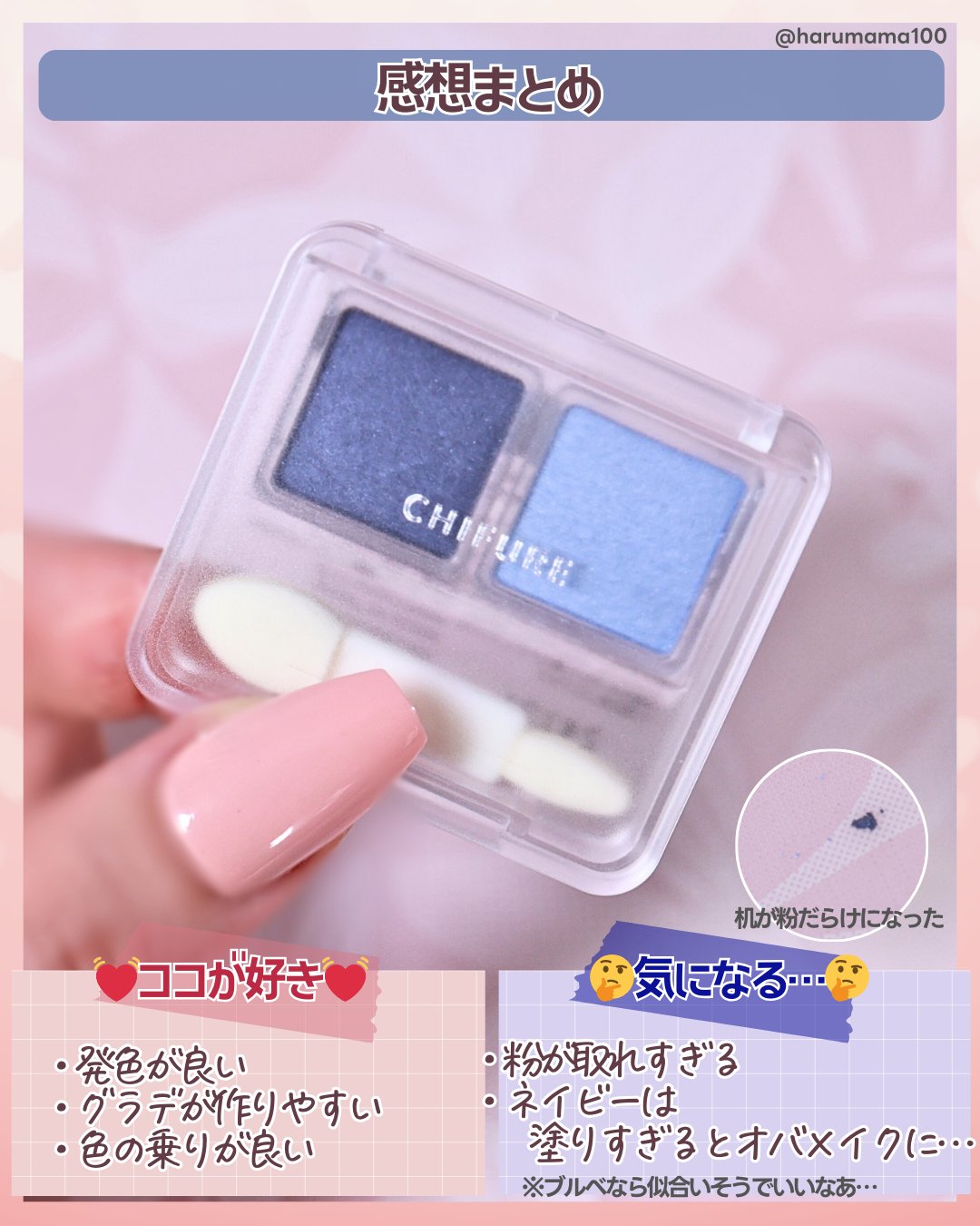 #ちふれ#ちふれ化粧品#ツインカラーアイシャドウ440円(税込)93ブルー系鮮やかで美発色のアイシャドウです。ちょっと粉っぽいというか、ダマになって取れる時があります。でも発色が良くて、ベースを仕込めば長時間OKです。この価格は驚きです。深い...