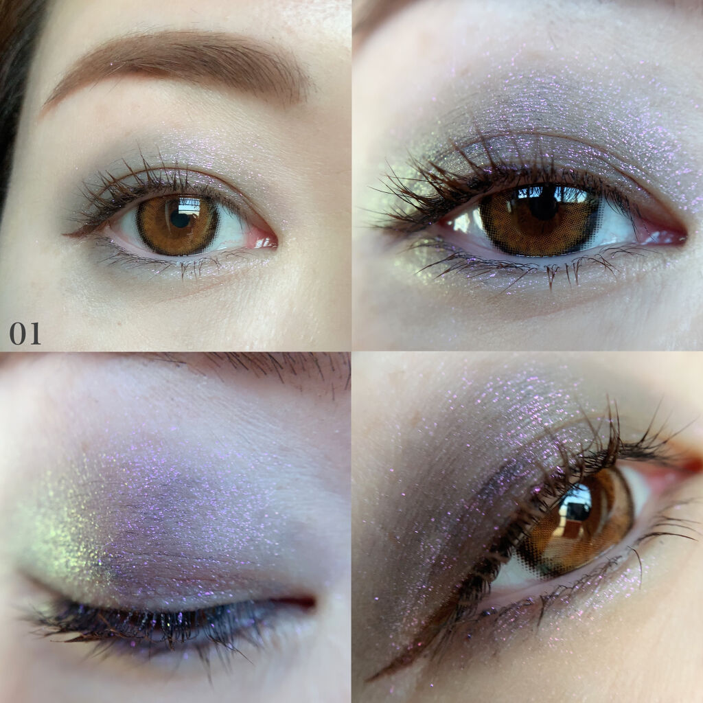 01blackangel見ためパープル、実際はダークグレーにピンクラメです。ラメが細かくてすごくきれいです!他の色はあんまりベースの色が出ないみたいなんですが、これは出るので私のような締め色がないと半分寝てるような目でも一色でアイメイク完成で...