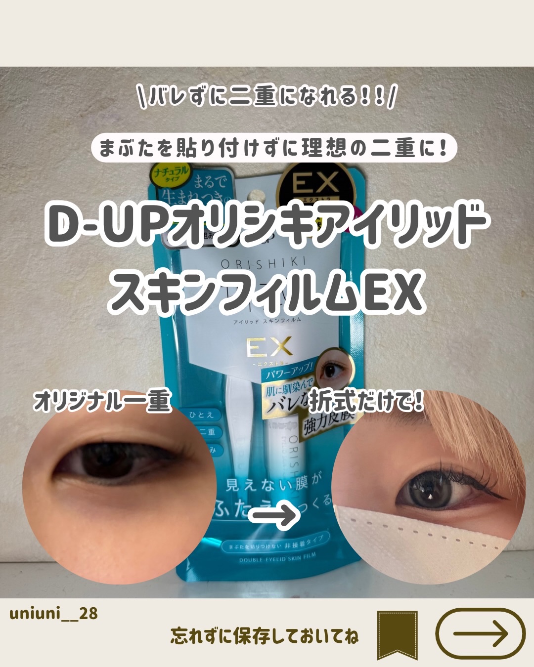 .D-UPオリシキアイリッドスキンフィルムEX#PRD-UPからパワーアップした『オリシキアイリッドスキンフィルムEX』が4月中旬に新登場🪄発売に際し先行で商品お試しさせていただきました。日によって二重だったり奥二重だったりでアイプチは試して...