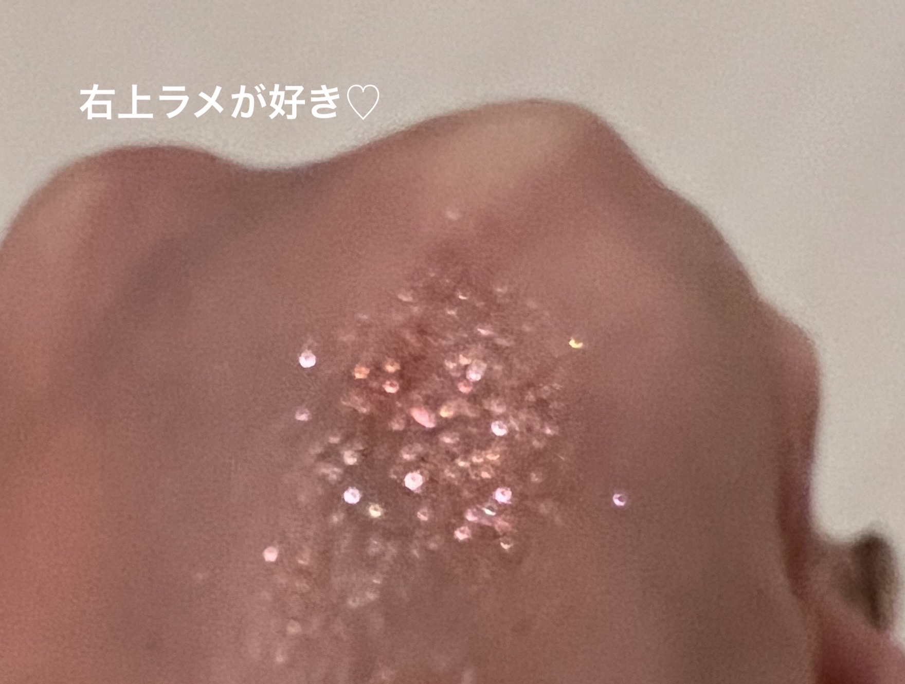 ラメのシャドウは粉っぽい感じですが、他のマットな色のシャドウは割としっとりしたテクスチャーでした😳発色は濃くもなく、薄くもなく、、という印象です!ただラメはめちゃくちゃ綺麗です✨なので一番よく使っています🙃手に塗っている上の方が左上の細かいラ...