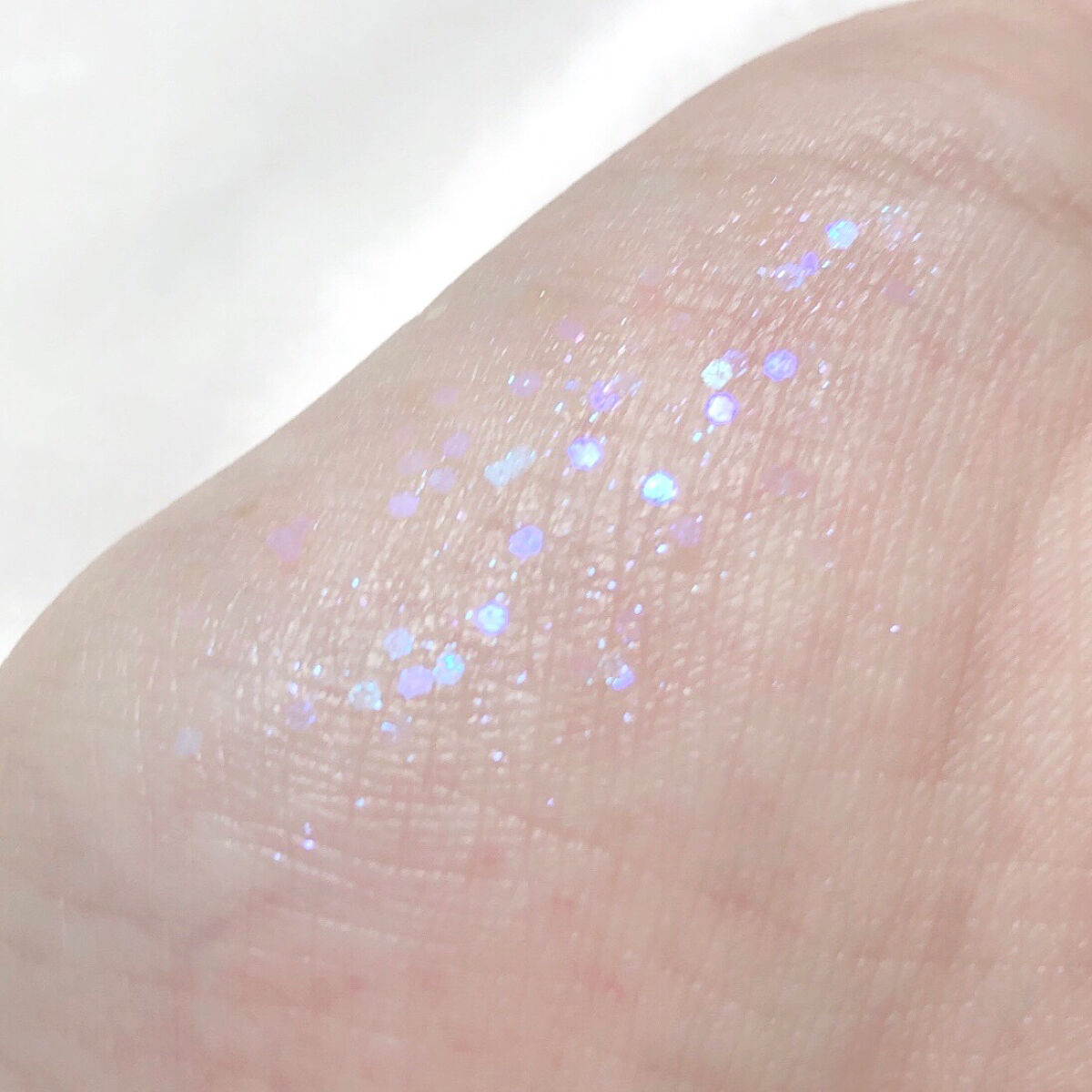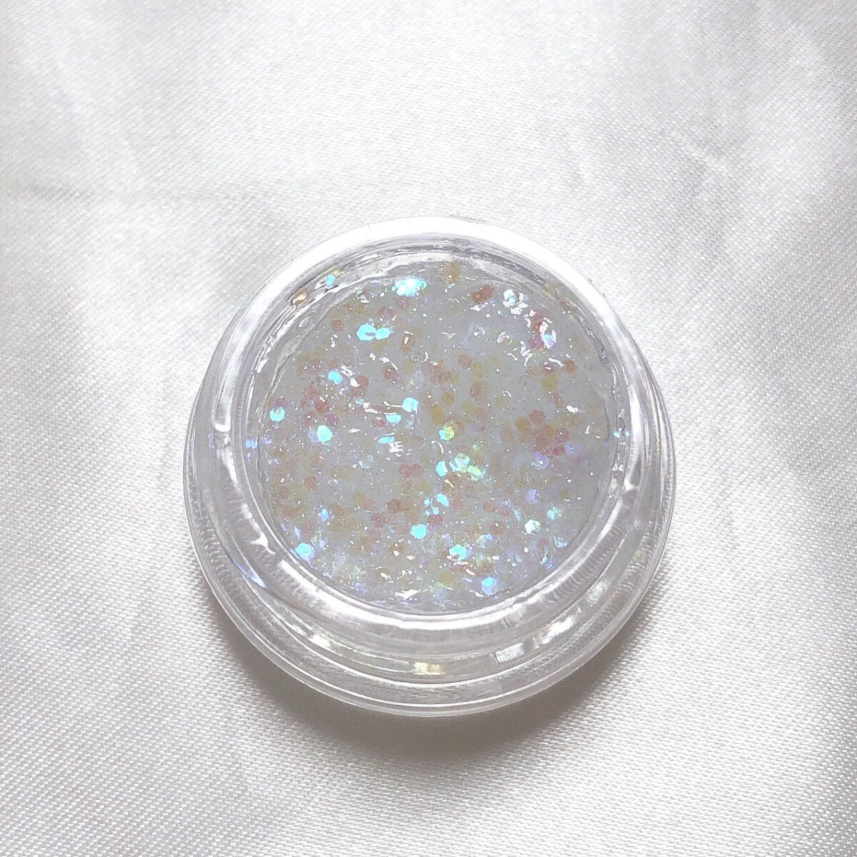 容器に入っている時はぷにぷにしていますが、実際手に出して伸ばすとピタッと密着してくれます。 カラー自体は透明ですが、ホログラムが入っているので角度によってキラキラがすごいです! 普段使いにはちょっと向いてないかなと思いますが商品自体は良いものなので、使い方によっては可愛く活用できると思います!