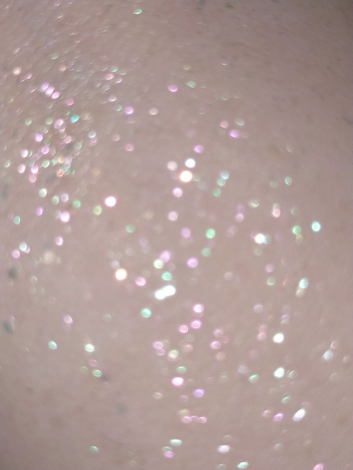 見た目オレンジなんですけど、塗ってみるとオレンジじゃなくて想像してたのと違いました。 細かいピンクラメ、細かいグリーンラメ、小さめ六角形のラメの集まりです。六角形は小さめだけど細かいラメたちと比べると大きいです。光り方はオレンジと言うかブロンズ??っぽい感じでした!! 筆タイプのグリッターじゃないので、ピンポイントに塗りたい場合は細筆が必要かも。指だと調整は難しいです。 思ってたのと違っても、めちゃ可愛いです🤭❤️