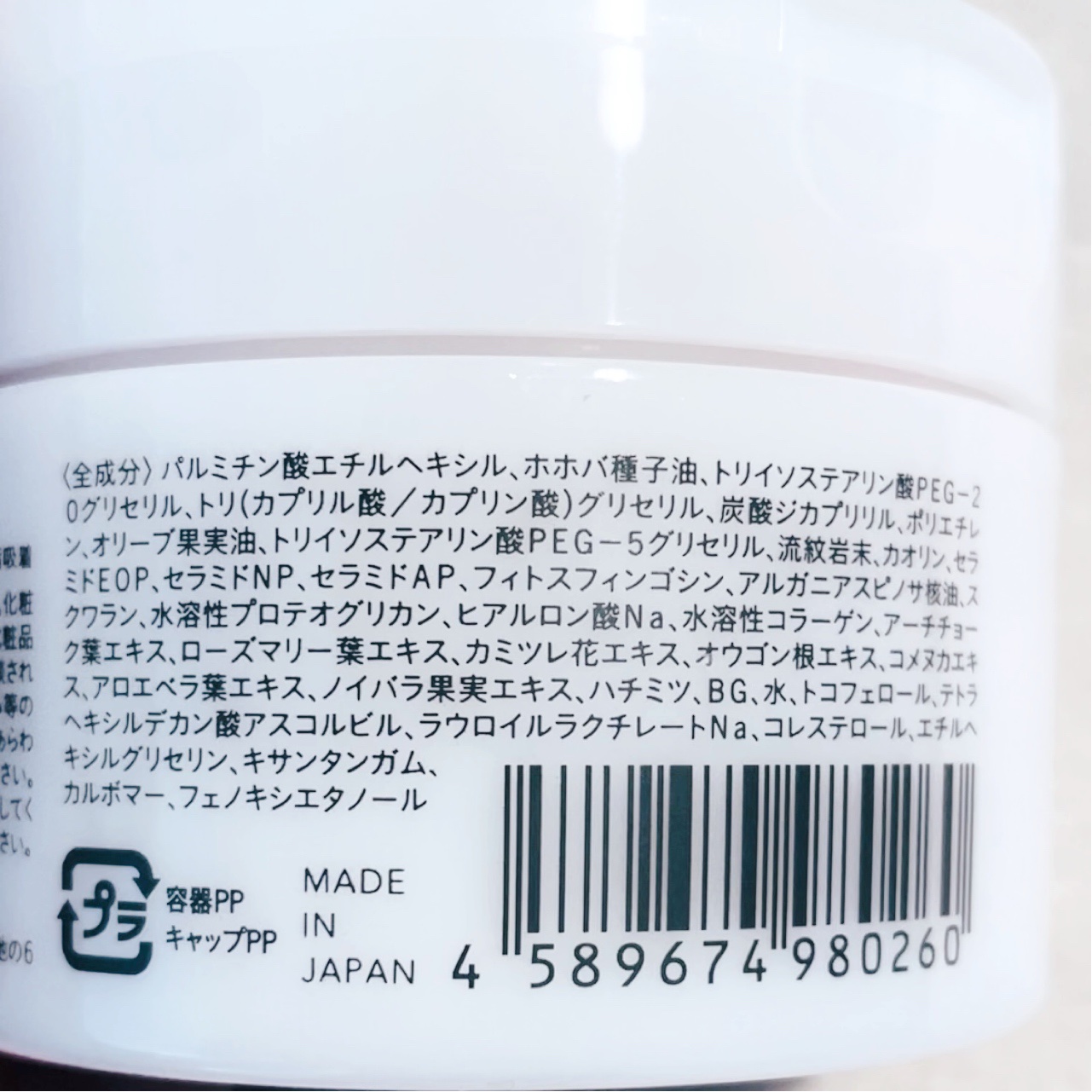 - パルミチン酸エチルヘキシル、ホホバ種子油、トリイソステアリン酸PEG-20グリセリル、トリ(カプリル酸/カプリン酸)グリセリル、炭酸ジカプリリル、ポリエチレン、オリーブ果実油、トリイソステアリン酸PEG-5グリセリル、セラミドEOP、セラミドNP、セラミドAP、フィトスフィンゴシン、アルガニアスピノサ核油、スクワラン、水溶性プロテオグリカン、ヒアルロン酸Na、水溶性コラーゲン、アーチチョーク葉エキス、ローズマリー葉エキス、カミツレ花エキス、オウゴン根エキス、コメヌカエキス、アロエべラ葉エキス、BG、水、トコフェロール、テトラヘキシルデカン酸アスコルビル、ラウロイルラクチレートNa、コレステロール、エチルヘキシルグリセリン、キサンタンガム、カルボマー、フェノキシエタノール