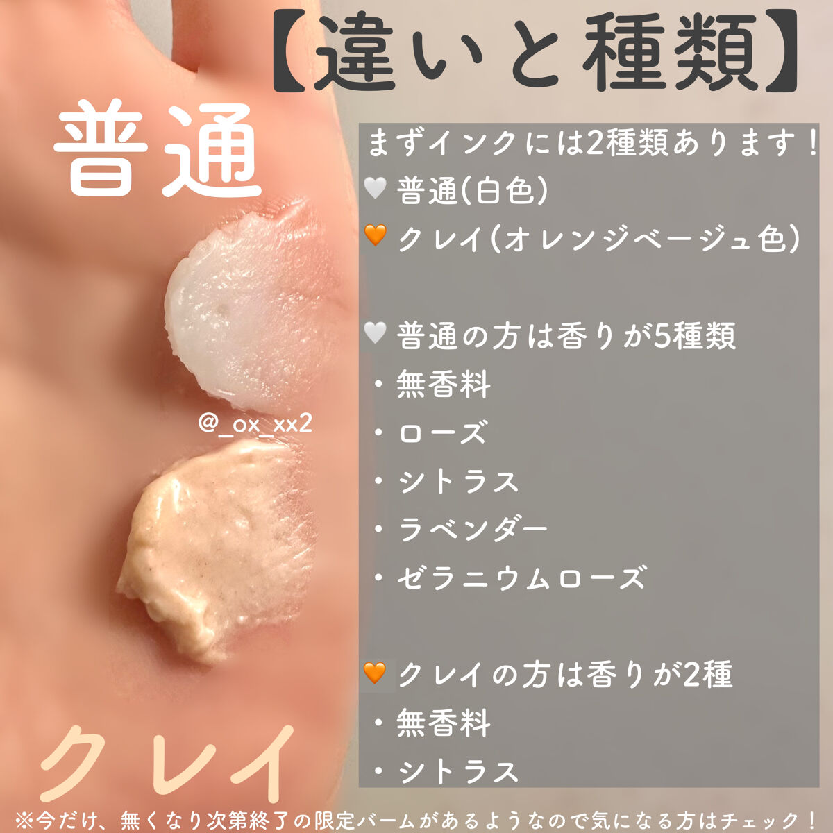 🤍普通のもの(白色) 🧡クレイ(オレンジベージュ色) 🤍普通の方の香りは5種類(無香料含める) ・無香料 ・ローズ ・シトラス ・ラベンダー ・ゼラニウムローズ 🧡クレイの方は2種類(無香料含める) ・無香料 ・シトラス ※今だけ限定のフレグランスバームというのも出てます!無くなり次第終了なので気になる方はチェックしてみてください!