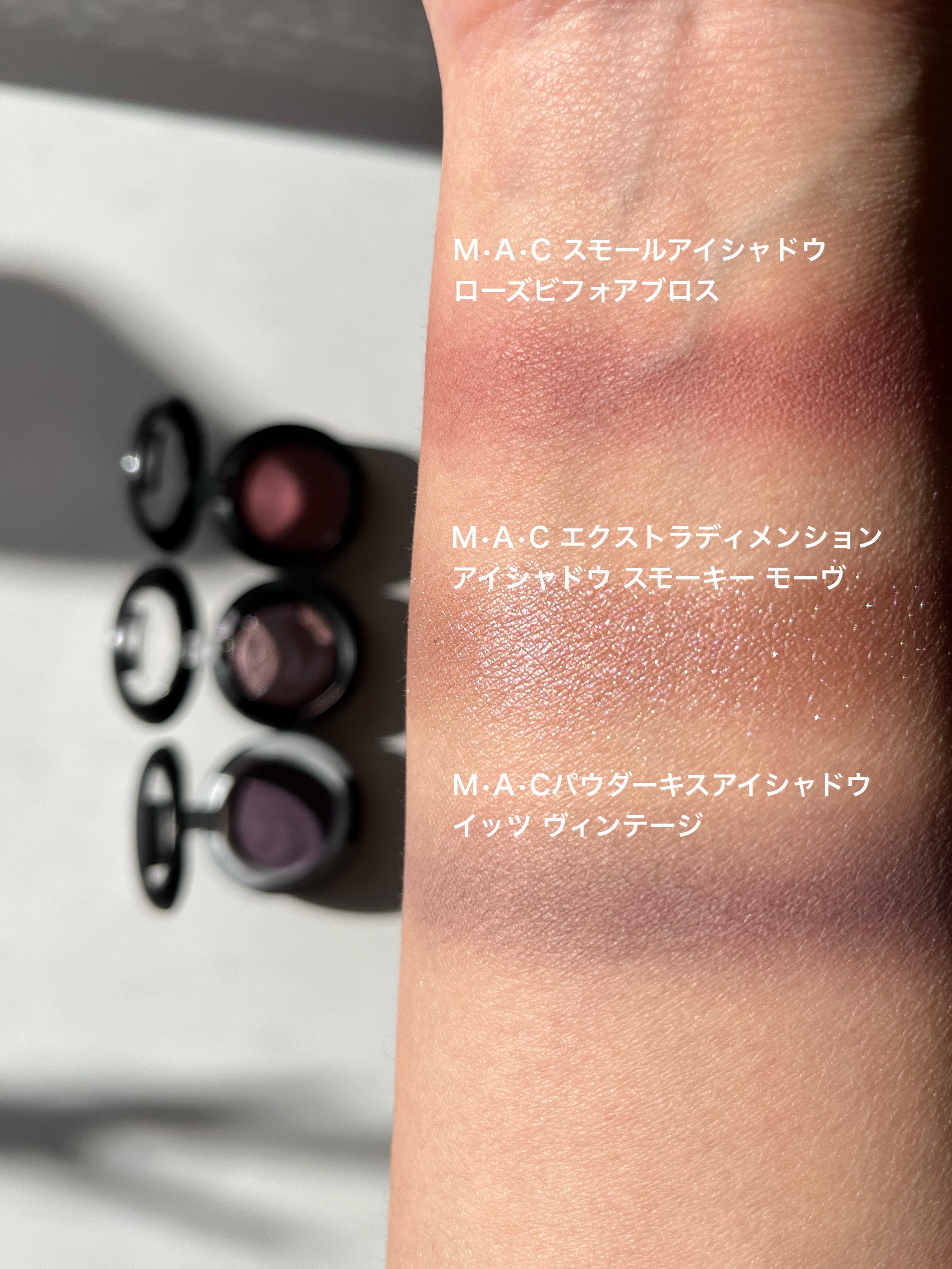 MAC #エクストラディメンションアイシャドウ #スモーキーモーヴ(クール モーヴ)税込¥4,290 👉上瞼と下瞼(ローズビフォアブロスに重ねる) MAC #パウダーキスアイシャドウ #イッツヴィンテージ(クール ダークパープル)税込¥4,290 👉上瞼目尻側にぼかす M•A•C #ミネラライズブラッシュ #ウォームソウル(ゴールドパールが輝くミッドトーンベージュ)税込¥4,950
