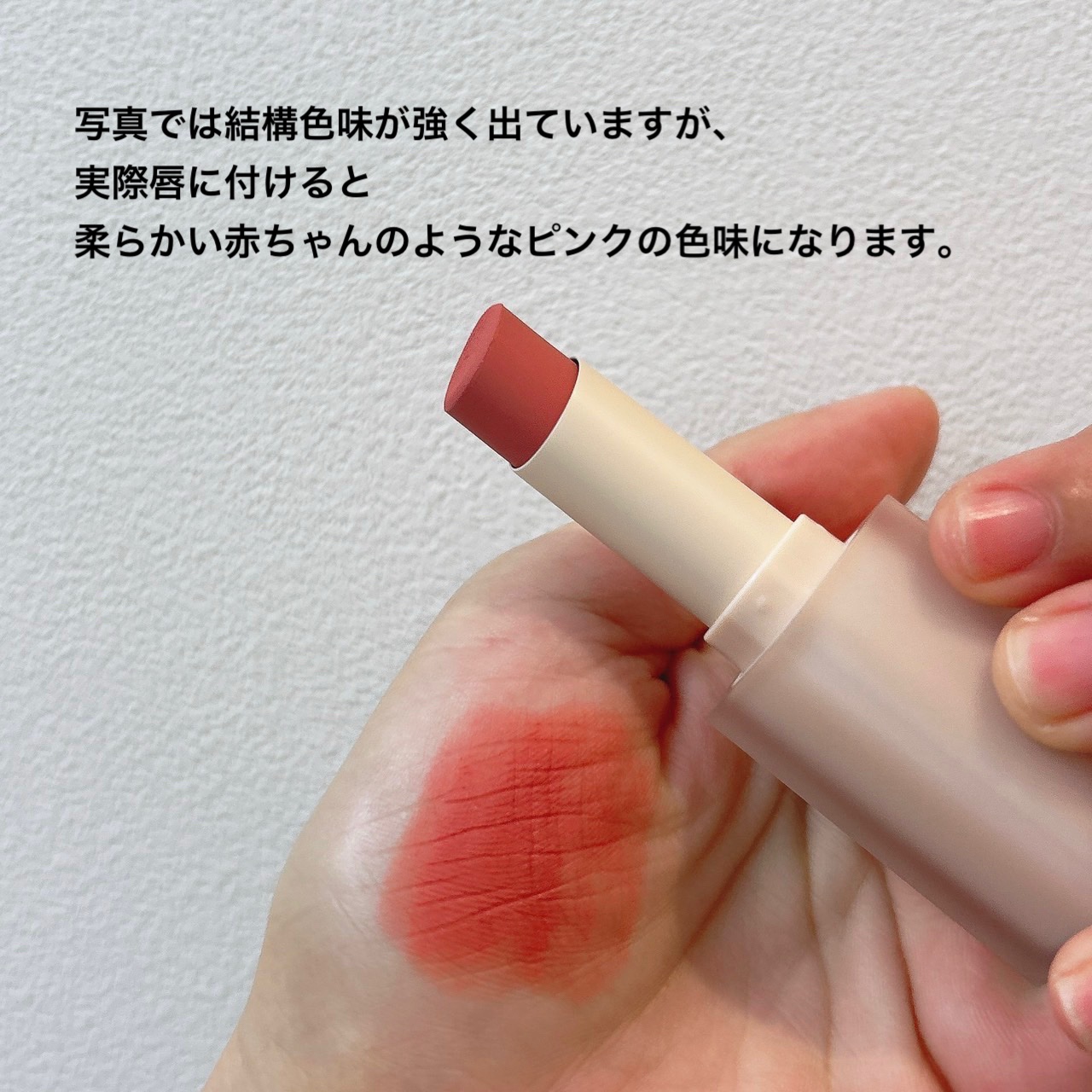 何も塗ってないような軽いタッチ感 ピッタリフィットする密着力 すべすべふわふわ塗り感 サーモンピンクブラウン。ヌーディーカラー♡唇を綺麗に可愛くみせてくれます! ティントではありませんが、ティッシュオフしてもふんわり色残りします✨ マット!フワッと軽い仕上がりです◡̈ パッケージも可愛くて女の子〜って感じ✨ 乾燥が気になるので、下地に保湿リップは必要ですが、とても可愛いです◡̈
