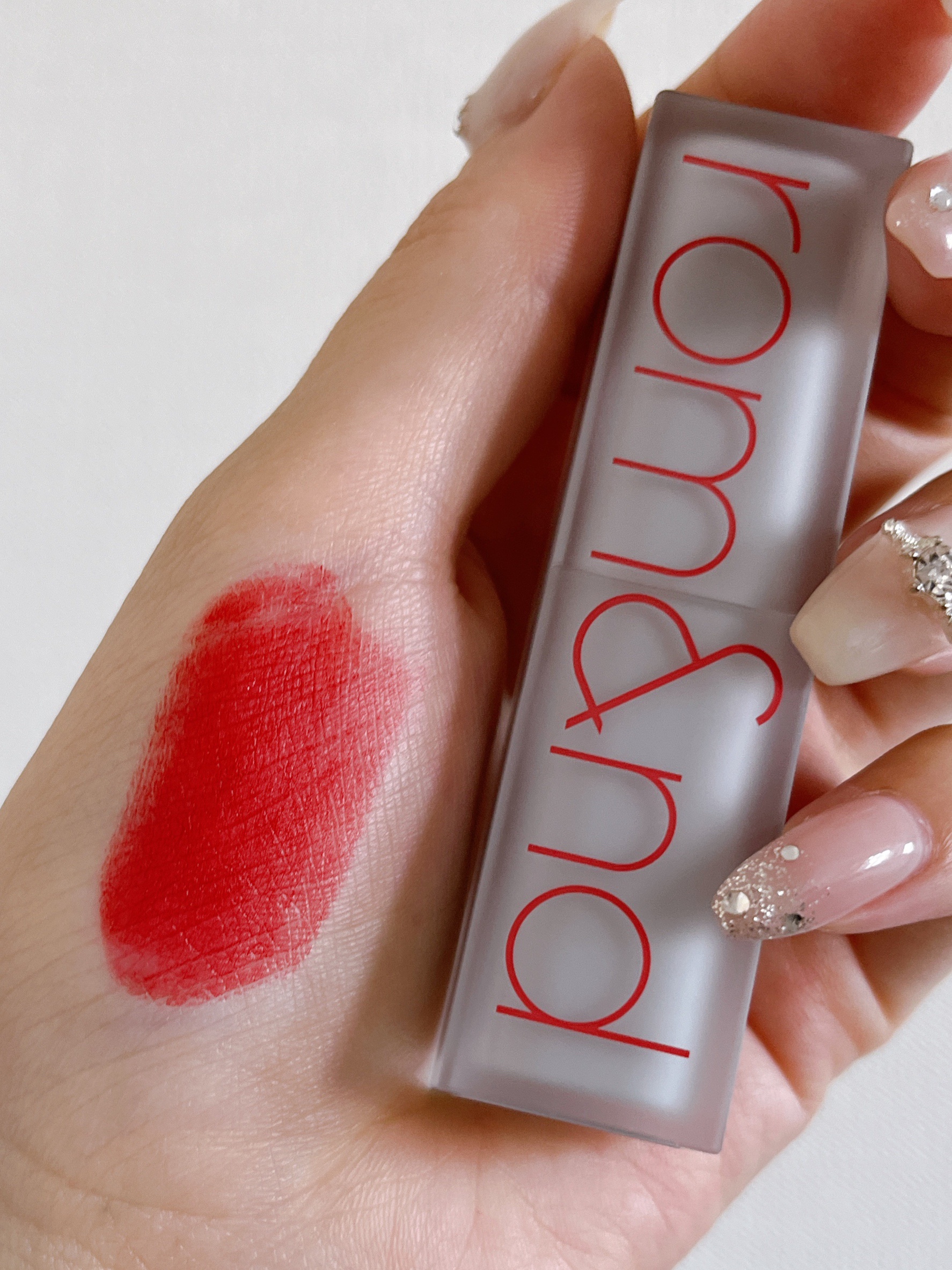 rom&nd ゼロマットリップスティック 17 レッドヒート はとても鮮やかな色味、 唇にはぽんぽんとぼかしたパターン、しっかり塗ったパターンを。 マットリップということもあり、 潤い系リップよりも乾燥感は多少気になるポイントでした。 パキッと発色するので赤リップを引き立てたいメイクには合いそうだと思います💋