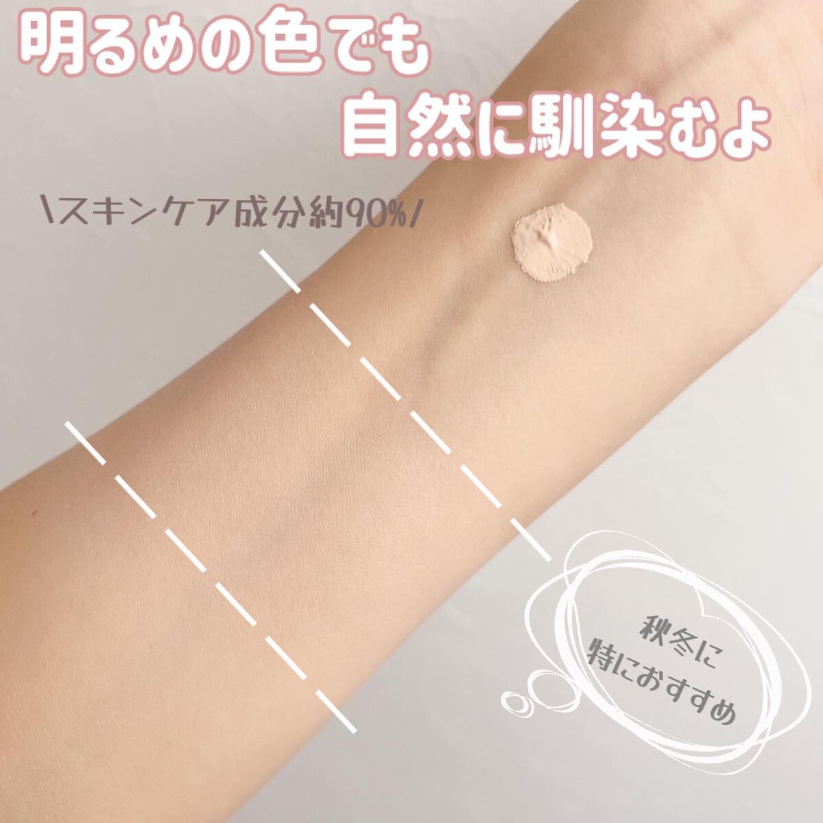 水が弾けるような塗り心地で、肌に乗せたあとは高密着。 肌の粗をカバーできるわけではないけど、肌全体をナチュラルに補正してくれて、良い感じのすっぴん肌になれます。 肌の調子がいい時はこれ一本、ナチュラルに仕上げたい時は全体にこれと部分的にコンシーラー、軽めだけどしっかり肌作りしたい時はこれを全顔に使って、頬の三角ゾーンにカバー力のあるファンデなど、色んな使い方ができる万能ファンデ。 乾燥肌の私はスキンケアが足りないまま使うと肌のアラが目立ちやすいことがあったので、保湿はしっかりしてから使うようにしてます。 使用している3番の色味は黄色よりのライトベージュ。 チューブタイプでコンパクトで持ち運びやすいのもお気に入りポイント。 薄い上にフィット感高いのでマスク移りはめちゃめちゃしにくい方だと思います。 ナチュラルな肌補正、軽い付け心地、マスク移りストレス…などを気にされてる方は気にいる確率高めだと思います👼🏻