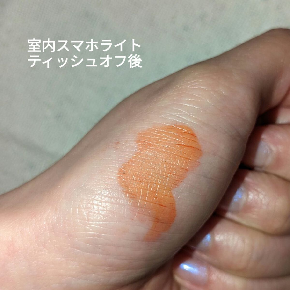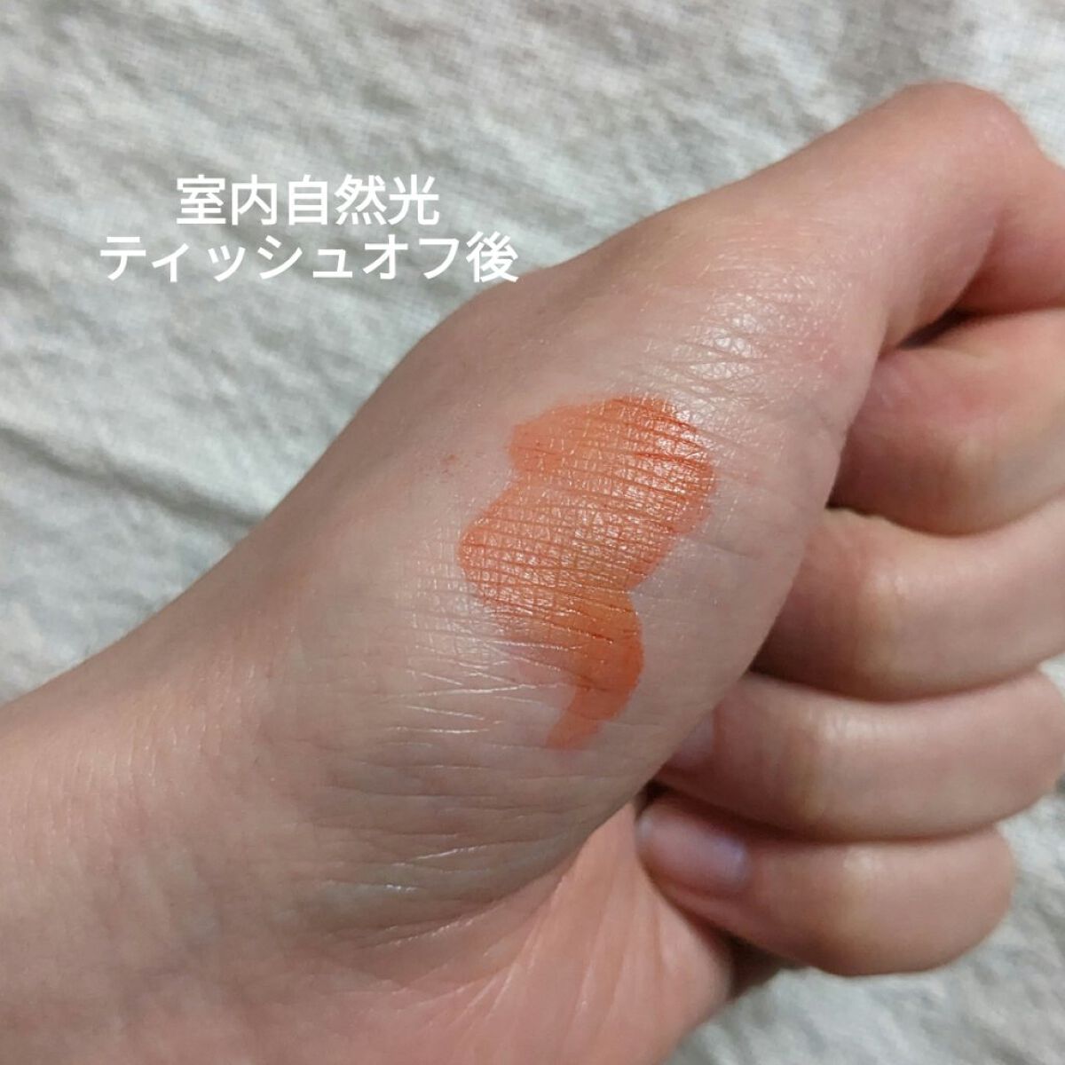 コーラルだけど、ティッシュオフ後はオレンジ味が強め? ティントとしてもすぐ落ちない(ご飯食べたら流石に落ちる) パサパサ唇にならないので、パケ買いしたけど気に入ってます! 絶対落ちないわけではないけど、その分負担が少ないはずなので、大切に使います!買って良かったです!