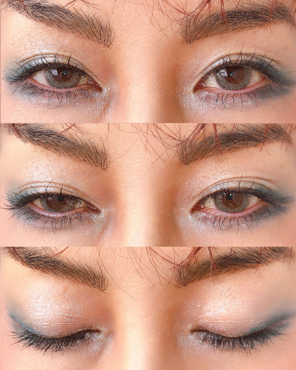 まず透明感を出すには「白」は必須! 顔の中心部分に主に塗り、側面はスポンジに残ったファンデを軽くポンポンする程度。 ミントグリーンはラメが望ましいです。 目頭側半分は、ETVOSだけ。 半分からはミント系を大きめに入れ締めのモスグリーンは細くシュッと。 まぶた中央と涙袋にはお手持ちの大きめのシルバーラメを。
