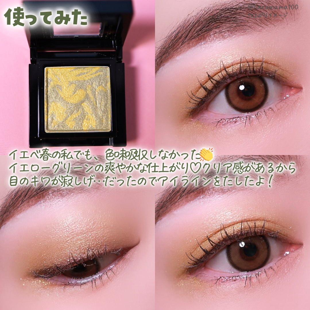 ⚠️写真5枚目から目元のアップが続きます閲覧注意⚠️ヴィセアヴァンシングルアイカラーマーブル125TROPICALCOCKTAIL輝きのあるイエロー×ピスタチオグリーンゴブラン織りのようなマーブル模様が可愛らしいViséeの春夏コスメです。少し前に既存のパプリカ🫑というカラーを紹介しましたが、比べるとやはりラメが入ったタイプは発色が穏やかな印象💡春らしい柔らかなウグイス色シャドウですが、地黒の私は単品で使うと目元がボヤけて見えてしまう為ブラックで締めてみました。う〜んとってもGALAXY…✨🪐👾🛸#プチプラ#プチプラコスメ#スウォッチ