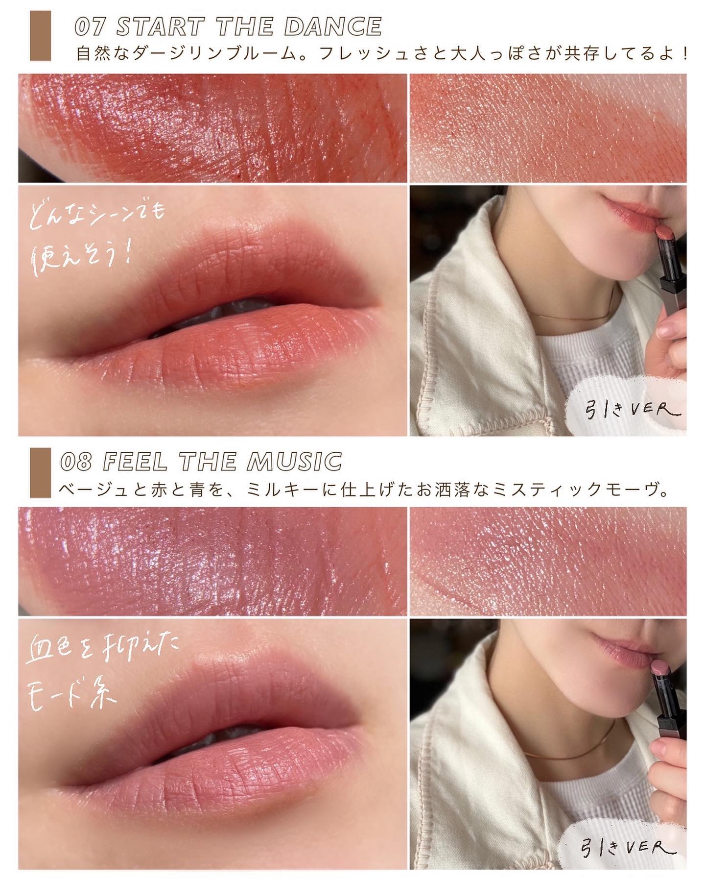 このリップ、知ってる?💄〜THREEの口紅もちゅるちゅるなのよ😚編〜THREEのリキッドリップ(2023春新作のやつ!)がめちゃくちゃ好きという話を少し前に熱苦しく語らせていただいたわけですが、実はもっと以前から発売されていたTHREEのスティックリップもお気に入りという話をしてもいいですか?それは#アライジングスピリットリップグローというもの。こちらのスティックタイプのリップ、もちろんリキッドほどではありませんがちゅるちゅる感に定評のあるアイテムで、『リップグロー』という名前の通り、唇がツヤツヤに仕上がる優れものです。以前06番はお気に入りオレンジリップとしてレビューしたことがあったかなと思いますが今回改めて現在販売中の全色をレビューしていきたいと思います🏃♀️▼アライジングスピリットリップグロー全7色各4,290円┈┈┈┈┈┈┈┈┈┈┈さてその塗り心地はと言えばまるでリップバームかのよう。ノールックでグリグリ塗れるつけ心地のよさとしっとりとした保湿感がお気に入りポイント。みなさん耳タコだと思うので毎度口うるさくて申しわけなのですが、唇乾燥民にとっては口紅の質感ってマジで大事。保湿力や引っかからないようななめらかなテクスチャー、そして艶やかさが重要だと思っていて、だからリキッドやグロスに走りがちなんだけど、このリップスティックはそんな乾燥唇さんでも心地よく使えると思うんですよね。そしてシアーな発色なので、色鮮やかだけど唇が主張しすぎることはなく!絶妙なこなれ感を演出できるのも大好き。塩顔なのでね、あんまり唇がパキッと発色しちゃうと顔が負けちゃうのよ🤦♀️つらみというわけでこのリップ、まさにそんな塩顔代表&唇乾燥民の私にはとってもいい塩梅🍵もし同じような悩みがある方がいたら、何も言わずにサッと差し出したくなるくらいおすすめ(それは変質者)やり過ぎず、主張し過ぎず、唇をしっとりキープしてくれちゃうお洒落リップ。とってもおすすめです。さてさて気になる色味はこんな感じ。■03PERFECTPOETRYエレガントなローズレッド、よく見ると青み系のパールがさりげなく入っていてクールな雰囲気にもなれる。透け感があるおかげでこなれた印象になるので、ローズカラーでもレディになり過ぎなくて◎■04DANGERAWAKENS明るく軽やなオレンジコーラルは、ヘルシーな血色感を唇にプラスすることができるカジュアルなカラー🍊ささっとラフに塗ってもサマになるのでお気に入り。■05EVOLUTIONDANGER情熱的でチャーミングなブライトスカーレットは、鮮やかで目を引く力強いカラー。ひと塗りでもパッと顔全体が華やかになるようなリップです。■06FUTUREDANGERヘビロテしている私のお気に入りカラー。フレッシュなオレンジにほんのりキャメルニュアンスを感じるような色味で、ただ爽やかなだけでなく、ぐっとこなれ感のあるお洒落なオレンジリップが完成しちゃいます🍊■O7STARTTHEDANCE自然なダージリンブルームは、フレッシュさと大人っぽさが共存しているような絶妙なカラー。どんなシーンにも間違いなく使えるような万能なカラーです。■08FEELTHEMUSICベージュにほんのり赤みと青みを感じるような色味で、そこにさらにホワイトのニュアンスをプラスして、ミルキーに仕上げたお洒落なミスティックモーヴ。唇の血色を抑えたような、モード感溢れる仕上がりに。■09TASTETHECOLORS深みと透明感を合わせ持つマルーンレッドは、一見鮮やかに発色するけど透け感があるので重たくならず、暗くなりすぎることもない絶妙なカラー。■番外編:#リップコンシャスプロテクターSPF35/PA+++3,080円デリケートな唇を紫外線ダメージから守るリップベース。これの素晴らしいところはほんのりコーラルカラーがついているところ、紫外線防止効果があるけど白浮きしなくて◎使用感はまるでリップクリームなので、色付きリップの延長でグリグリ使えます。唇こそ、皮膚が薄いからダメージを受けやすいので、しっかり紫外線ケアした方がいいからまあとりあえずこれはぜひポチってください(番外編の割にめちゃ語る)リキッドもいいけど、スティックもいい。この夏はTHREEのリップでフレッシュなお洒落顔になっちゃいましょ😚🤍みなさんはどのカラーが気になりますか?🏃♀️┈┈┈┈┈┈┈┈┈┈┈┈┈┈┈┈┈🕊まりか@mk_____ch元アパレル勤務のアラサーOLがトレンドコスメや垢抜けメイクを発信中#おえかきコスメ#コスメ好きさんと繋がりたい#コスメレビュー#コスメ#イエベ春#デパコス#リップ#つやぷるリップ#threecosmetics#垢抜けメイク#口紅#デパコスリップgiftedby@threecosmetics#推しデパコス