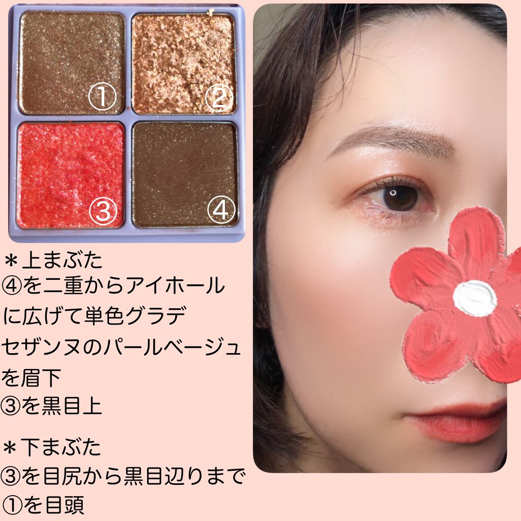 ~先日のメイク~☆使用コスメ*rom&ndネオンムーンベターザンアイズ#04DryEveningPromise*CEZANNEシングルカラーアイシャドウ#01パールベージュ*UZUBYFLOWFUSHIMOTEMASCARA™#COPPER*lauramercierブラッシュカラーインフュージョン#05フレスコ*NARSオーディシャスシアーマットリップスティック#00265*☼*―――――*☼*―――――*☼*―――――*☼*―――DryEveningPromiseは全色ラメがキラキラのパレット✨②のオレンジゴールドのグリッターはさすがにギラギラ過ぎて職場にぬってく勇気がなかったので、それ以外の3色でメイクしました。それでもキラキラしてたけど😂スウォッチの写真の倍キラキラです。写真技術が無さすぎて、いつも着画のラメが全然撮れないのが残念…😢皆さんどうやって撮ってるの?🤔🤔🤔目がキラキラ過ぎたので、リップはマットにしました。(マスクで隠れちゃうけど😅)NARSのこのリップはマットでも乾燥しにくいです!🙌他は、いつもの私のド定番アイテムを使いました~。#一生貢ぎたい神コスメ#私の底見えコスメ#推しウォータープルーフ