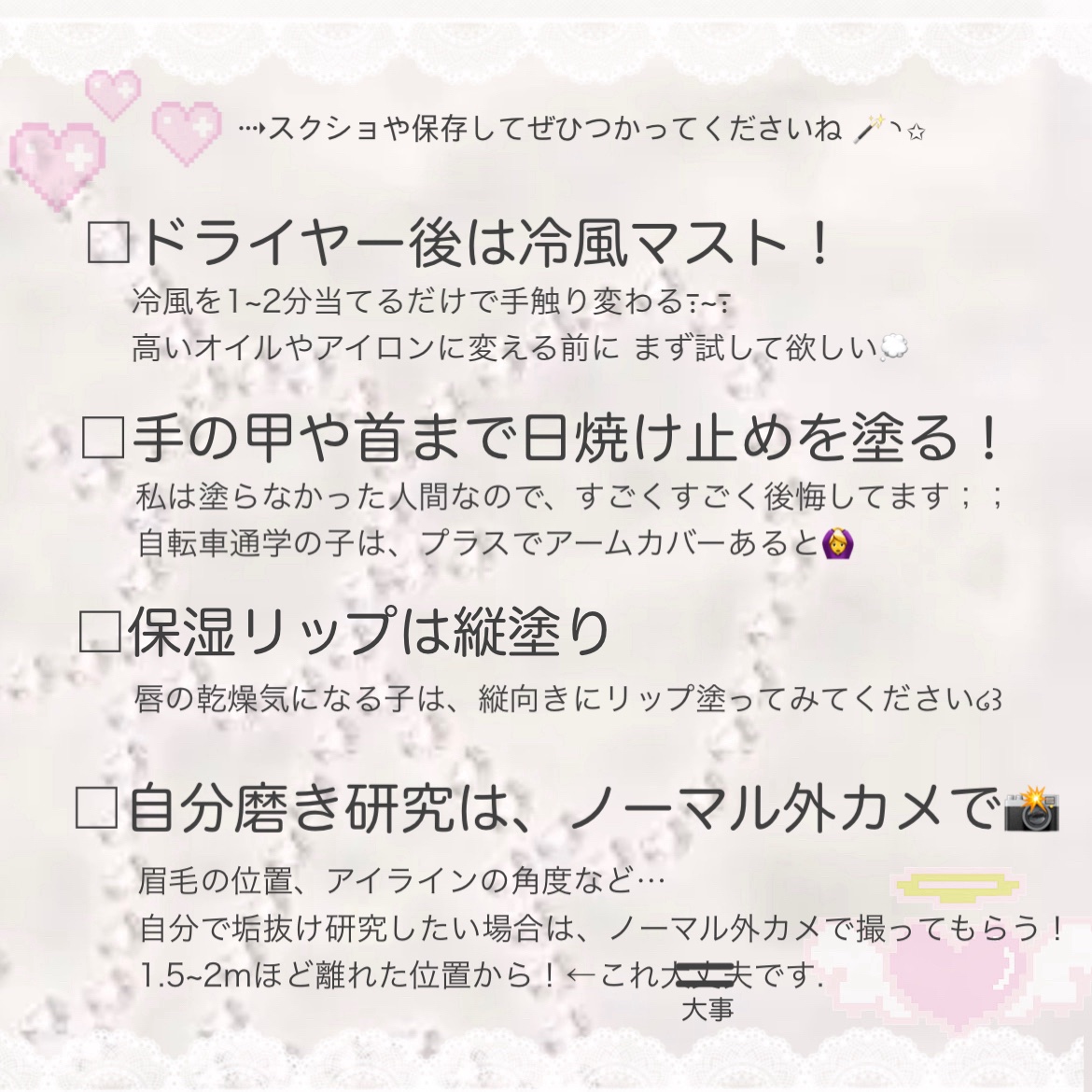 中高生の子にとどけたい📧💬今日からできる0円美容🪄︎︎◝✩˖˚⊹ᖭི༏ᖫྀ⊹˚˖˚⊹ᖭི༏ᖫྀ⊹˚˖˚⊹ᖭི༏ᖫྀ⊹˚˖私が妹や後輩がいたら絶対教えてあげたい!と思う美容法🌟࿐⋆*特に冷風ドライヤーは、最近私もめちゃメリット感じてて毎日してますʚꨄ︎ɞほんとに中学生時代の自分に声を大にして言いたい߹~߹スクショや保存して、ぜひ使ってみてください𓏲𓎨彡˖˚⊹ᖭི༏ᖫྀ⊹˚˖˚⊹ᖭི༏ᖫྀ⊹˚˖˚⊹ᖭི༏ᖫྀ⊹˚˖#プチプラ#垢抜け#0円美容#ヘアケア#リップケア#日焼けケア#自分磨き#スクールメイク⬇️おすすめの日焼け止めと保湿リップです♡⃣