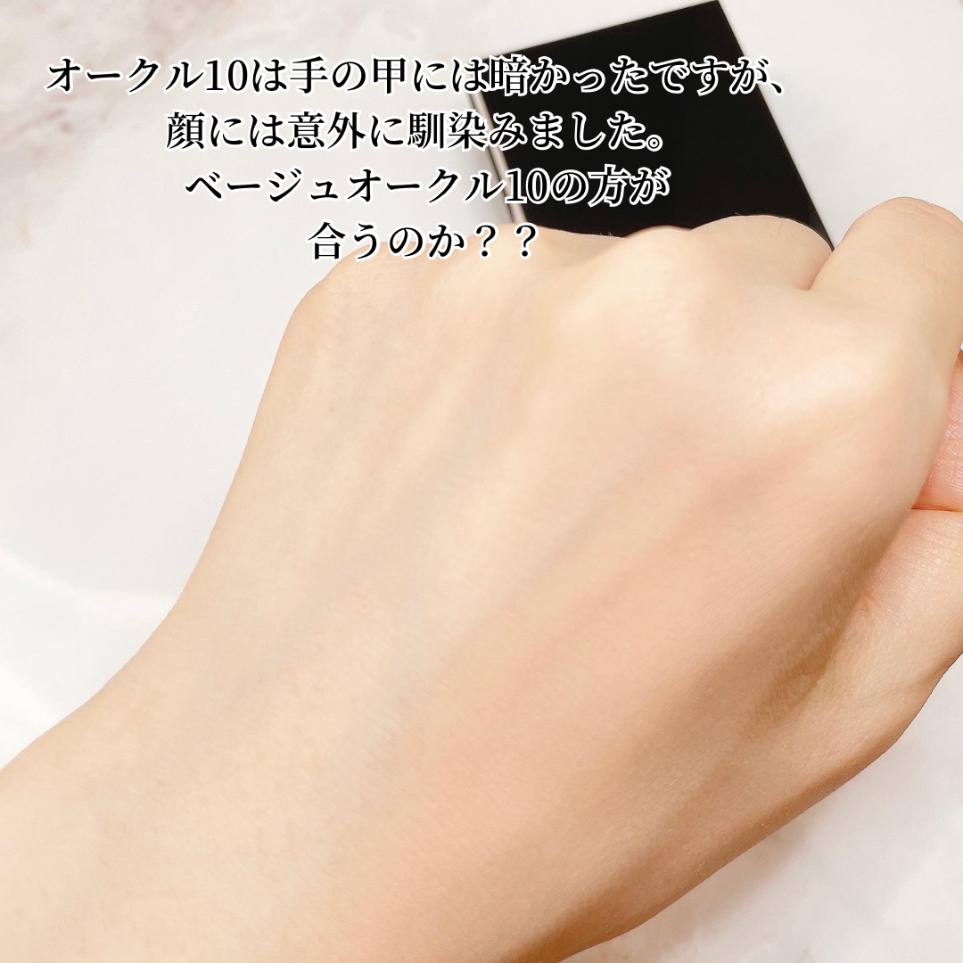 顔に塗ってみた感想は…肌なじみがよく、とっても自然!!素肌みたいな自然な仕上がりになります♡ パウダーファンデーションは粉っぽくなりがちですが、これはそんなことはなかったです。口元や目元も粉をふいたようにならずきれいです。 私が一番気に入った点は…ふわーっと肌に乗って、負担感がないところ。軽いつけ心地で、すごく楽。驚きました。 私はかなり黄みが強くて赤みのない肌なのですが、どのブランドの商品も標準色(オークル)だと合いません。いつも黄み肌向けの色を選んでます。 このオークル10も若干合ってない印象。全く合わないというほどではなく、使える範囲ではあるものの、でもやっぱり私には少し赤みが強い感じ。黄みよりの肌向けに、ベージュオークル10とベージュオークル20が展開されてるので、肌が黄色いかたはそちらを選んだ方がいいかもしれません。 多めにつけましたが、粉っぽくならずなじんでます。少しツヤもあります。