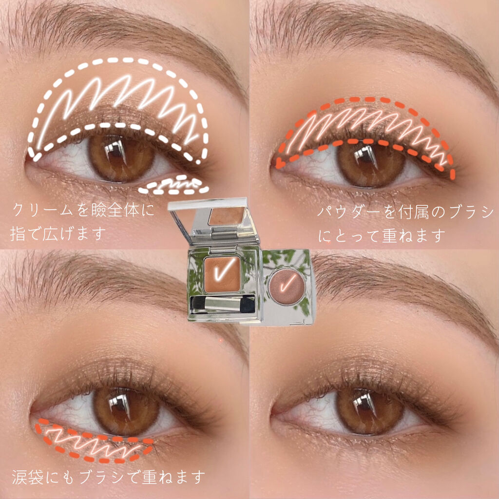 左のクリームベースは発色がふわっとしていて使いやすく、クリームなのにヨレたり二重幅に溜まったりしなかったです。 右のパウダーは結構ラメがしっかり入っていて目元に深みが出る感じ…!こちらも発色は控えめです。 2つの違う質感がセットされていることで、あまり頭を使わず、適当に瞼にぱぱっと塗るだけで目元に抜け感が出てしっかり盛れるところが好き𓇢𓆸 上瞼にクリーム、下瞼にパウダーというように分けて塗っても可愛いし、上からパウダーをのせてもニュアンスの違う色味になってより大人っぽいメイクに♡ 今回はクリームをアイホールに広げてからパウダーを重ねてみました𓂃◌𓈒𓐍 キャメルオレンジがメインの、深みもあるけど抜け感のあるアイメイクに仕上がりました🌼𓂃 𓈒