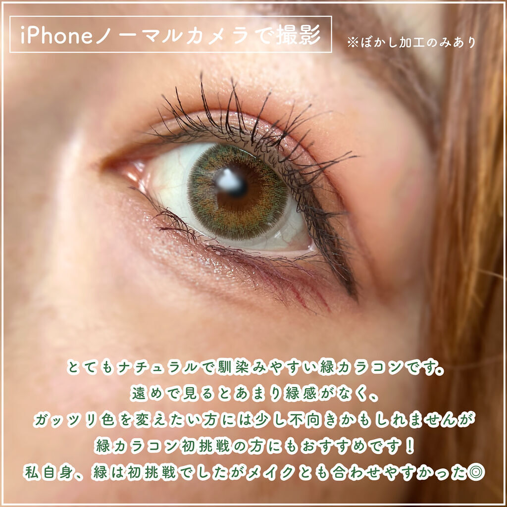レンズを見る限り発色良くて派手かなと思ったんですが 付けてみると暗めでよく見ると緑って感じになって すごく良きでした🙆🏻♀️ ピエナージュシリーズはドライアイでも あまり乾かないのでそこがめっちゃ好きです😘 ブラウンメイク、オレンジメイクに合いそうなので 気になる方はぜひチェックしてみてください💗