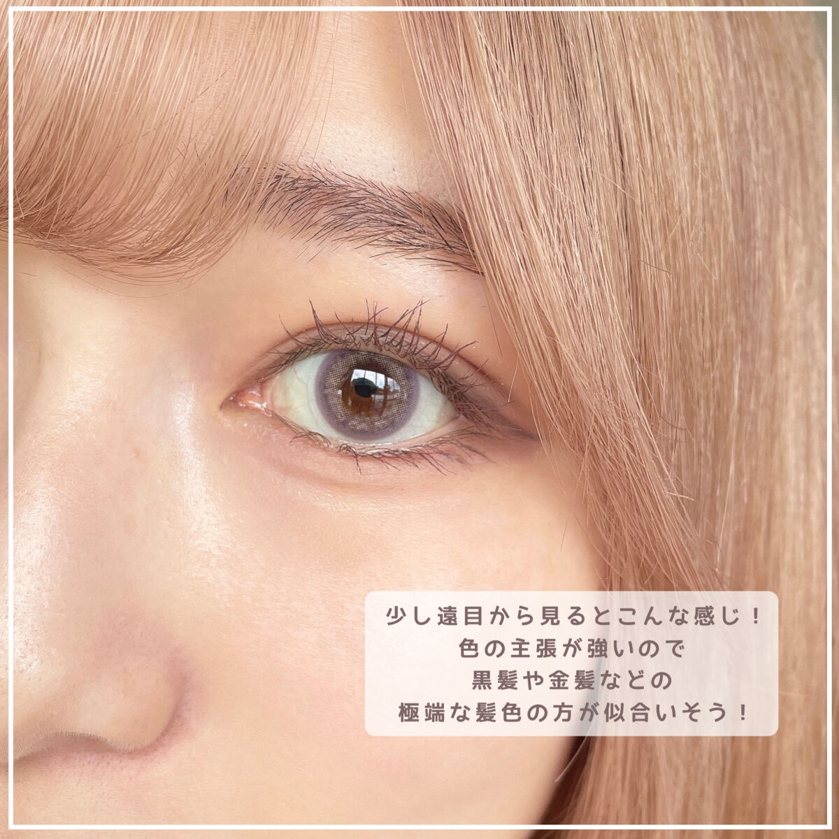 ピンク系にも挑戦してみたくて紫が強いピンクって感じです。ほんのり色付くのでナチュラルに儚い目になります。UVカットなのも嬉しい〜一日つけていてもゴロゴロしないので使いやすかったです。💗以下レンズ詳細 ̄V ̄ ̄ ̄ ̄ ̄ ̄ ̄10枚入・ワンデーDIA:14.0mm着色直径:13.0mmBC:8.7mm含水率:55%