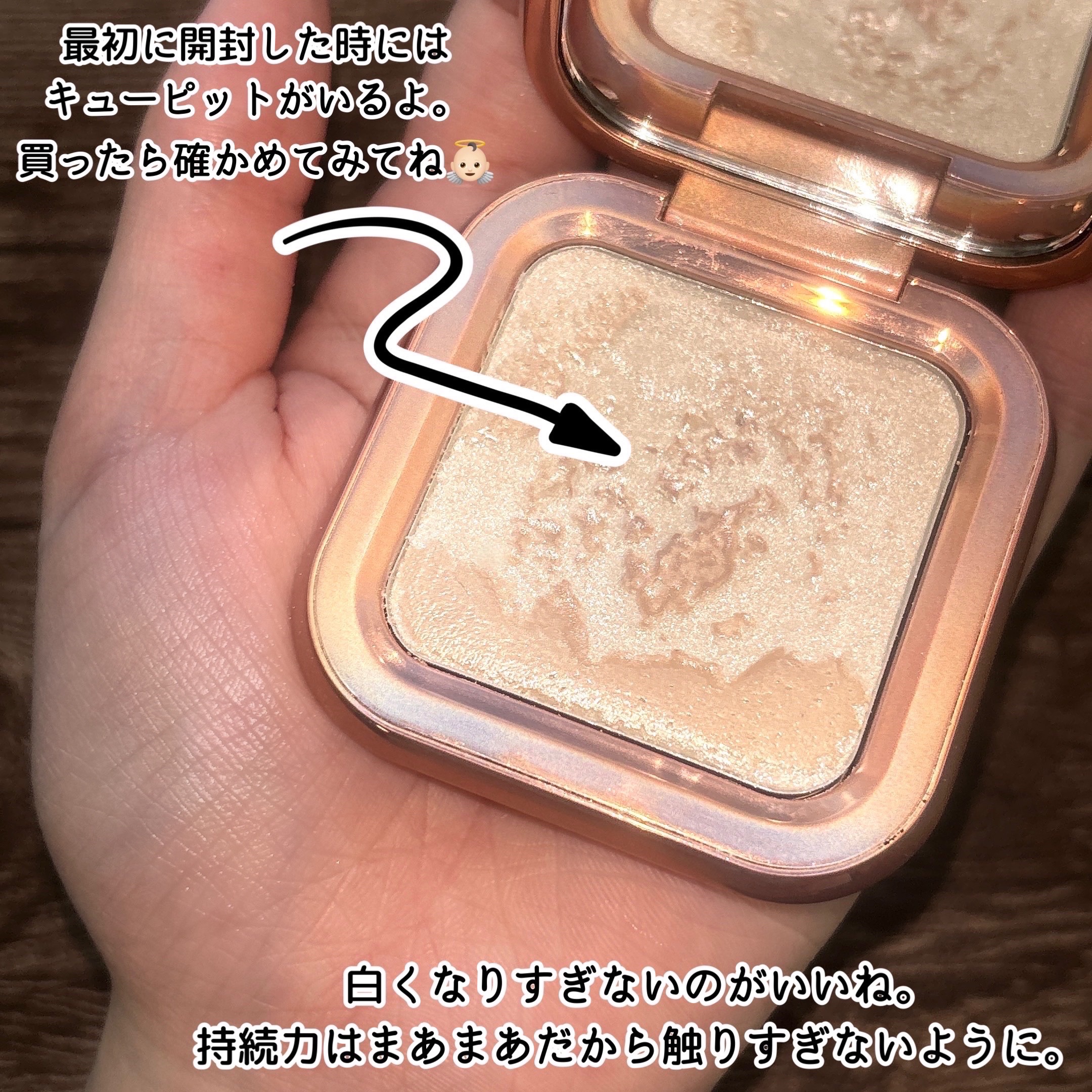 パケが先ず可愛い♡ 開いても天使がいて可愛い👼🏻♡ ホワイト系のハイライト持ってないし欲しいなーと思い立って探して行き着いた先がこれ✨ 届いて塗ってみたら、レビュー通りパール系でギラつかず安心☺️💕