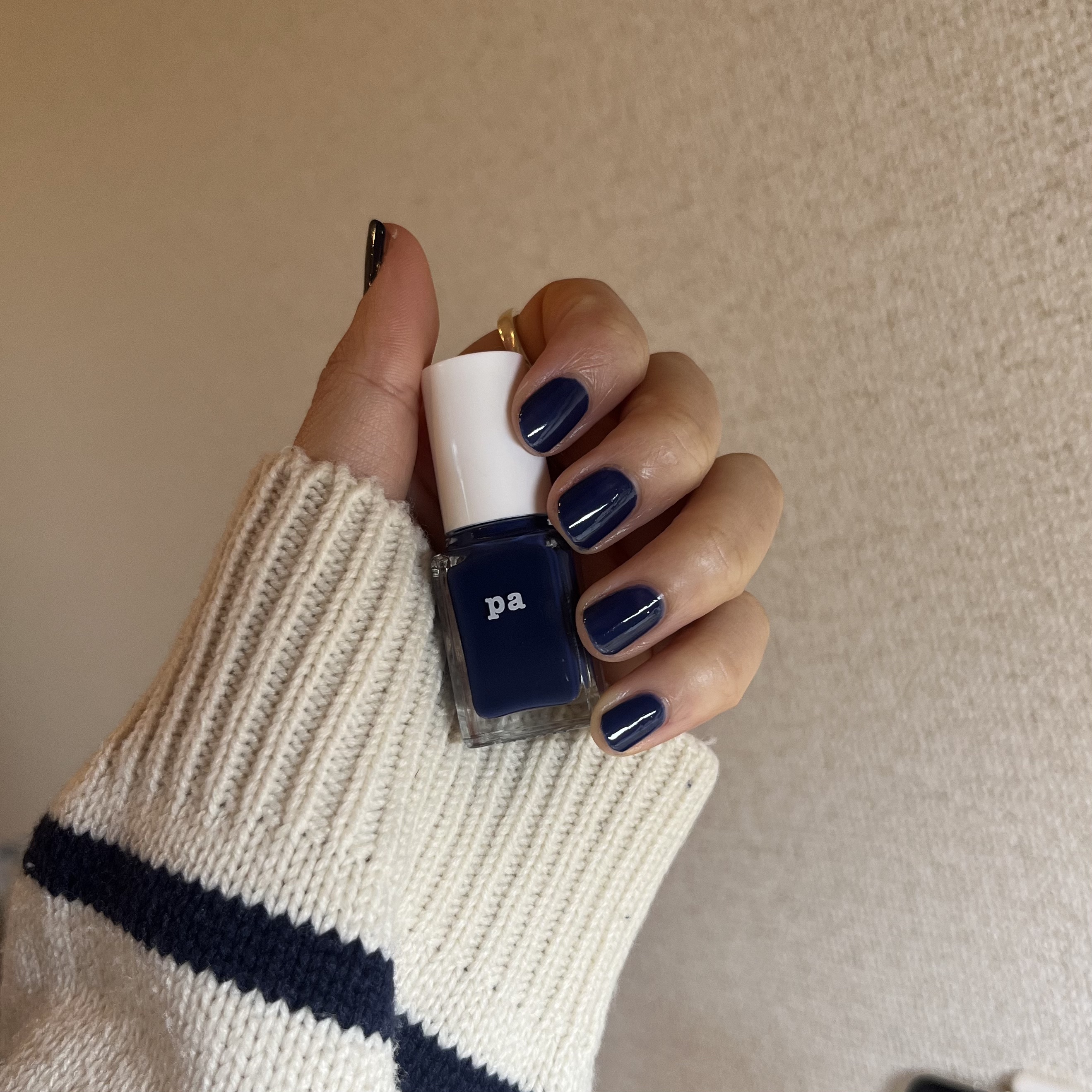 みて!!かわいい!!色!!はみでたとこはみないで!!【使った商品】paネイルカラーS050【商品の特徴】秋らしいネイビーのネイルカラー。小さめボトルでとてもお安い。1度塗りでムラなく塗れたらシアーなかわいい色に!!下手な私には無理でした。シアーだけどグラデは厳しいかも。2度塗りでボトルと同じカラーに👌秋にぴったりだなぁと思いました🍁単色で画像載せましたが私はキラキラ乗せるのが好きです。最近お気に入りのキラキラができまして…それは次に投稿しようと思ってます☺️#ネイル#セルフネイル