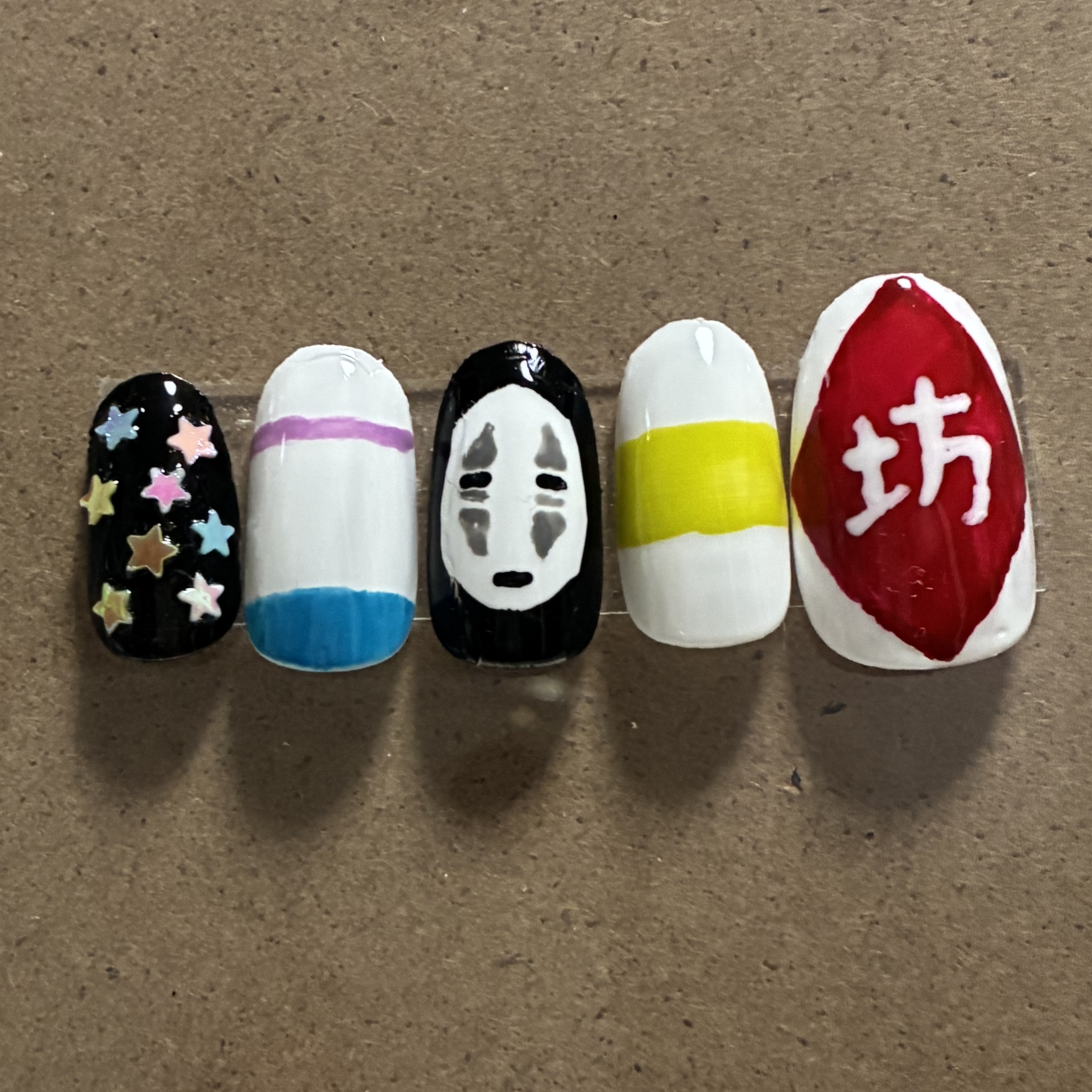⛩️アニメイメージネイル千と千尋の神隠しマニキュアですがチップにて作成しています使用アイテムpaネイルカラーS027ホワイトS031グレーS041パープルS049ブラックS063グリーンS068ライトブルー星パーツ#セルフネイル#アニメイメー...