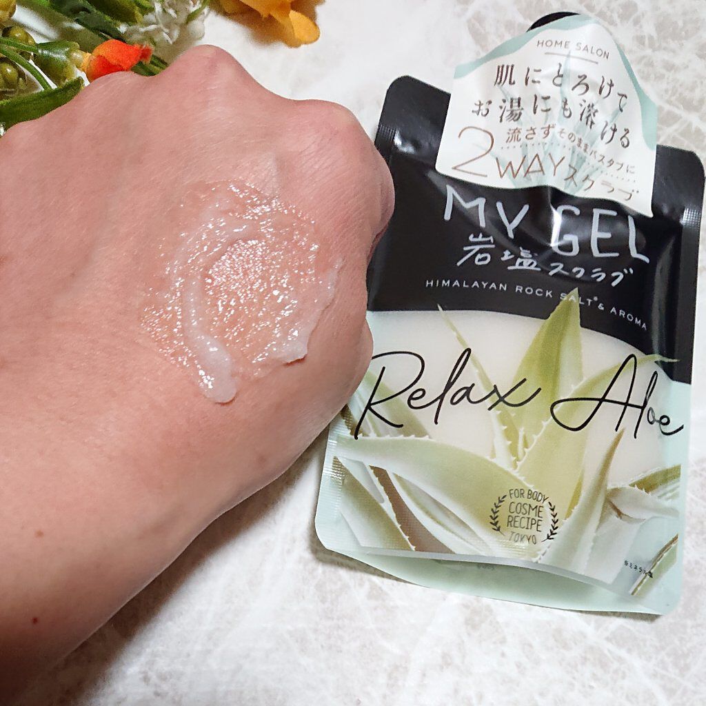 コスメレシピMYGEL岩塩スクラブをいただきました!リラックスアロエのいい香り(もう1種はアロマレモン)ソルトスクラブを広げた後流さずそのまま入浴することでバスアロマにもなります。粒は小さめで肌当たり優しく角質ケアができ、お湯に溶けやすい。お...