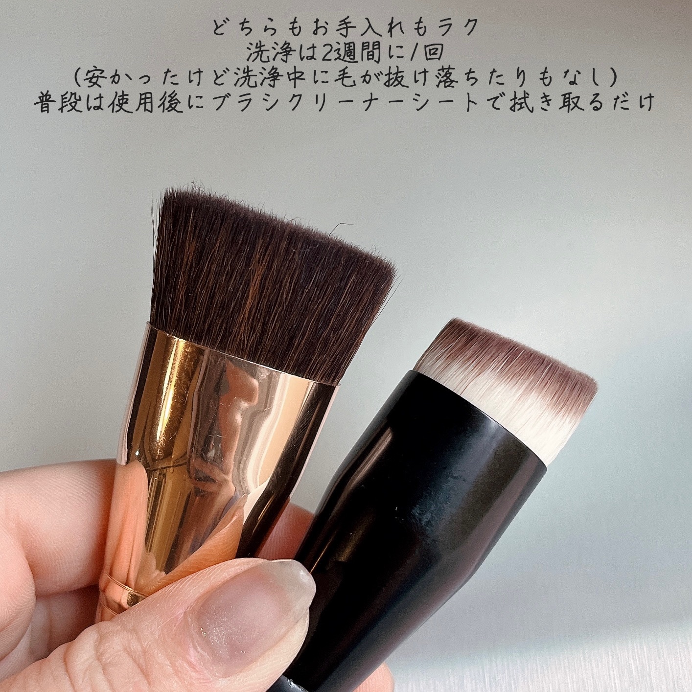#鉄壁ベースのすすめ徐々に暖かくなって湿度も増してきたあたりから頬のベースメイクの毛穴落ちが酷く目立って汚なすぎる😢普段から使ってるベースやファンデ、パウダーを高いものに新調すべき!?と本気で悩んでたときにSNSを観てヒントを得たのが"ツールを変更する“ということ今までブラシ塗りなんてプロやメイク上級者向けテクニックだというイメージが強く、個人的に苦手意識を持っていたブラシ塗りに挑戦して約2週間、、徐々に慣れてきてこれが大正解でした✔️ベースは手で塗り、あとはお気に入りブラシ2種を使ってベース完成。リキッド、パウダーともに重ねても厚塗り感が控えめなのにつるんとした陶器肌を作れてメイクしたてのような綺麗な状態を長時間キープ使用したツール手っ取り早く自分にも扱えそうなブラシを3種類購入(ドン・キホーテメイクブラシコーナーで発見したノーブランド品)・リキッドファンデーションブラシ円形ナナメカット、コシの強い毛質リキッド、クッションファンデの含み良好◯塗り筋やムラになりにくい・マルチファンデーションブラシ楕円形で毛質柔らかい毛足フワフワタイプリキッドも塗れるけど、パウダーを均等に取れて相性が良かったので現在は仕上げパウダー専用に◯・平べったい舌型👅ブラシ(画像には載せてません)リキッドは塗りやすいけど、クッションファンデが取りにくく、塗り筋、ムラになりやすかったため難易度が高く感じたので現在はお蔵入り✖️ここ最近はベースはラロッシュポゼUVトーンアップローズクッションはV&A仕上げにマシュマロフィニッシュパウダーを使用しています使用ベース等を変更せずにメイクの仕上がりに差を付けたい方は一度お試ししてみて下さい🌱プチプラでも満足のいく仕上がりになりました😍(パッケージ破棄してしまったので使用ツールの情報が曖昧で申し訳ないです😇)※全て個人の感想なのでちょっとした参考までにどうぞ#ファンデーションブラシ#ベースメイク