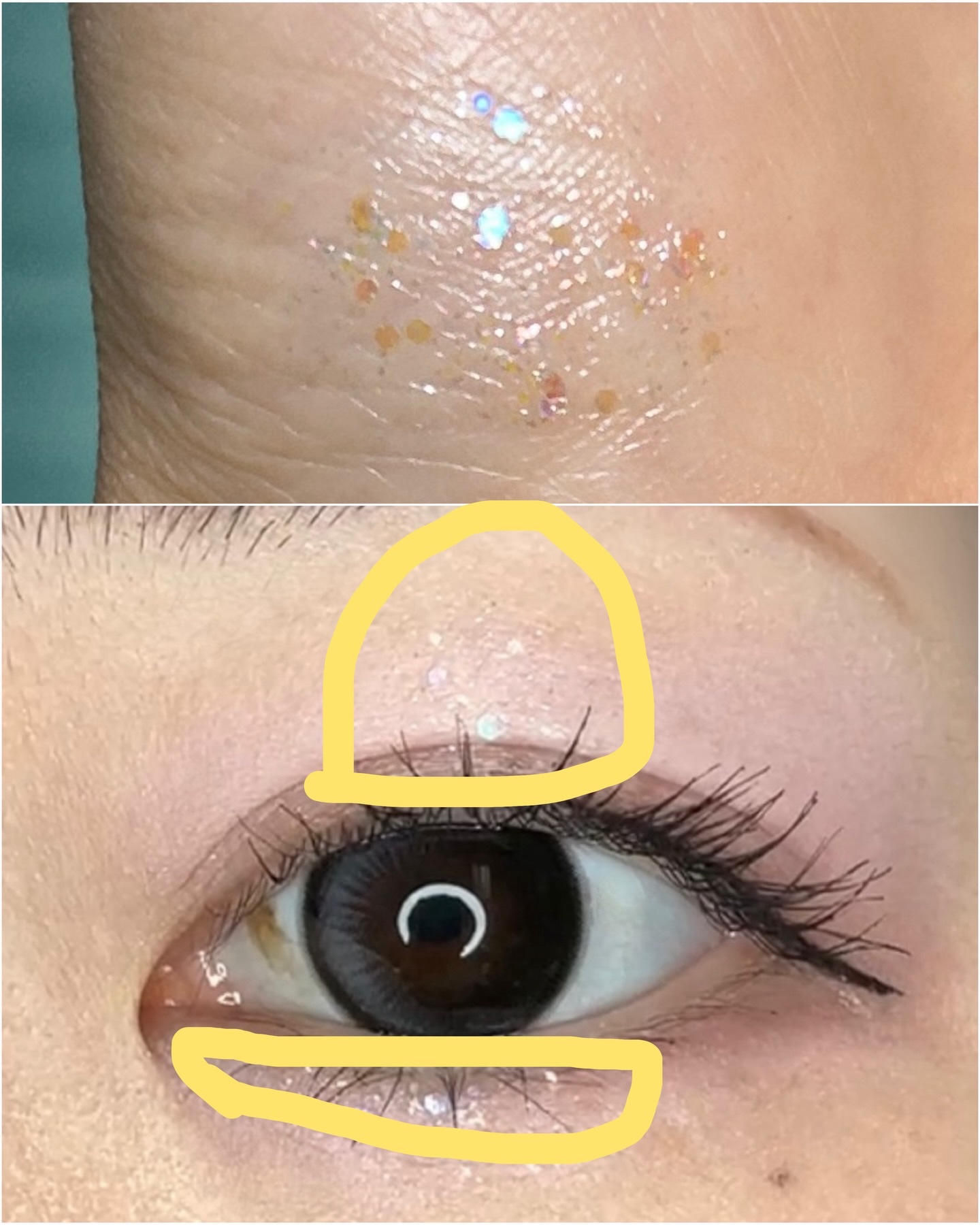 塗る時はしっとりしているが 乾いたら長時間密着してくれサラッとしている🤝🏻 よっぽど強く擦らなければ寄れません🤗 チップは柔らかい毛を使用。 一度に取れる量は少ないかな?って思います😗 ポイントメイク涙袋にもってこいですが、 大粒グリッターはチップに着く時と つかない時があるので 2、3回は、重ね塗りします🥺 香りは接着剤のような感じですが、そこまで 強い香りって訳ではありませんでした!