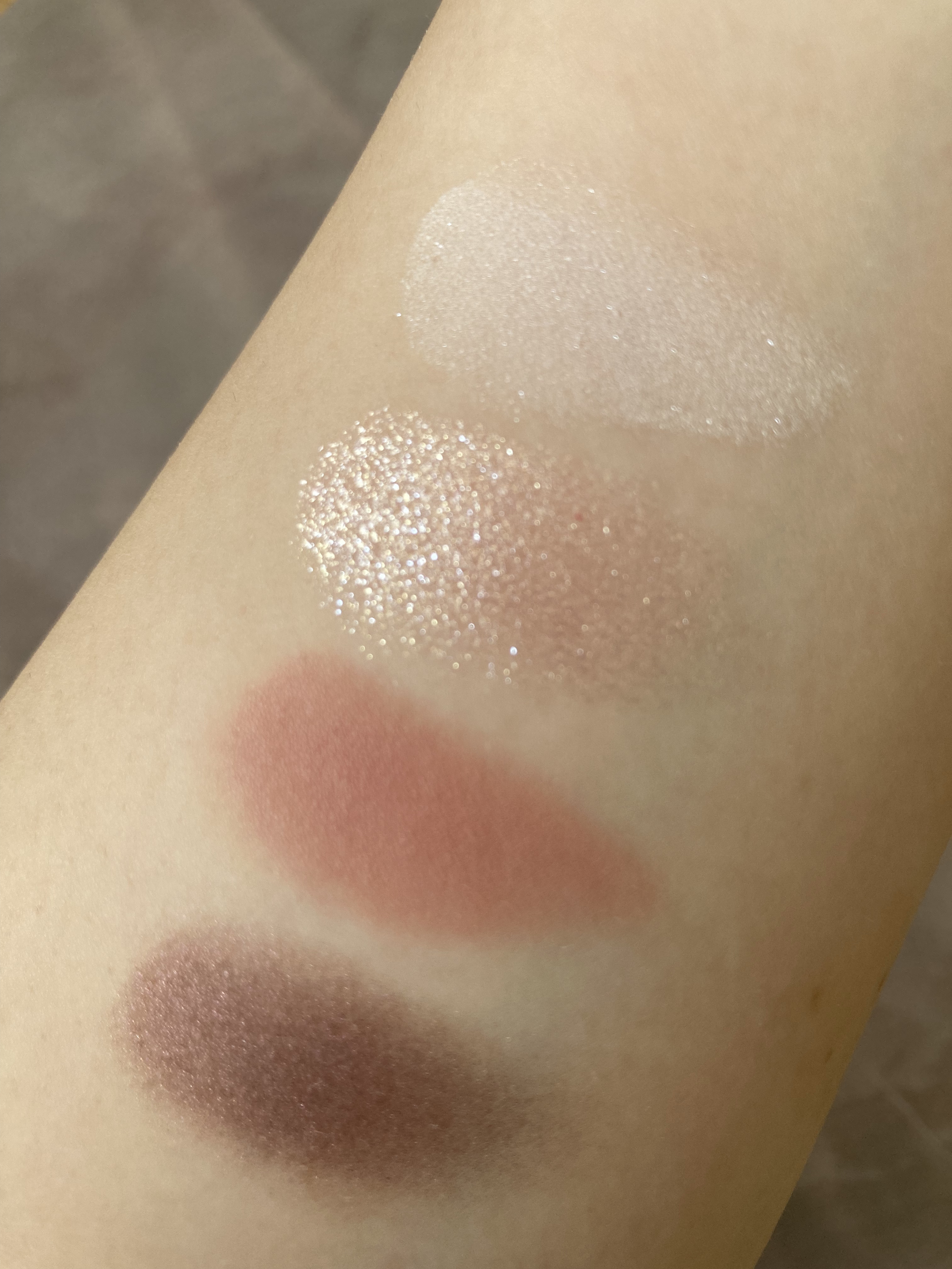 上品なくすみローズカラーは青みにも黄みにも寄らないニュートラルなカラーなのでローズ系の色ではありますがイエローベースの方も使えます☑️ 左下のローズカラーだけくすみ系の色です。くすみが苦手な方は右上の細かい繊細なラメを重ねるとくすみが軽減されるのでおすすめです◎ 左上のホワイトベースは、ブラシで薄くのせるとやや艶っぽさのでる仕上がりに⭐️ このホワイトベースの上から左下のローズを重ねると単色で使うよりやわらかい色みになります 右上の細かいラメは本当に繊細で重ねると濡れツヤな仕上がりになるのでとても綺麗です。