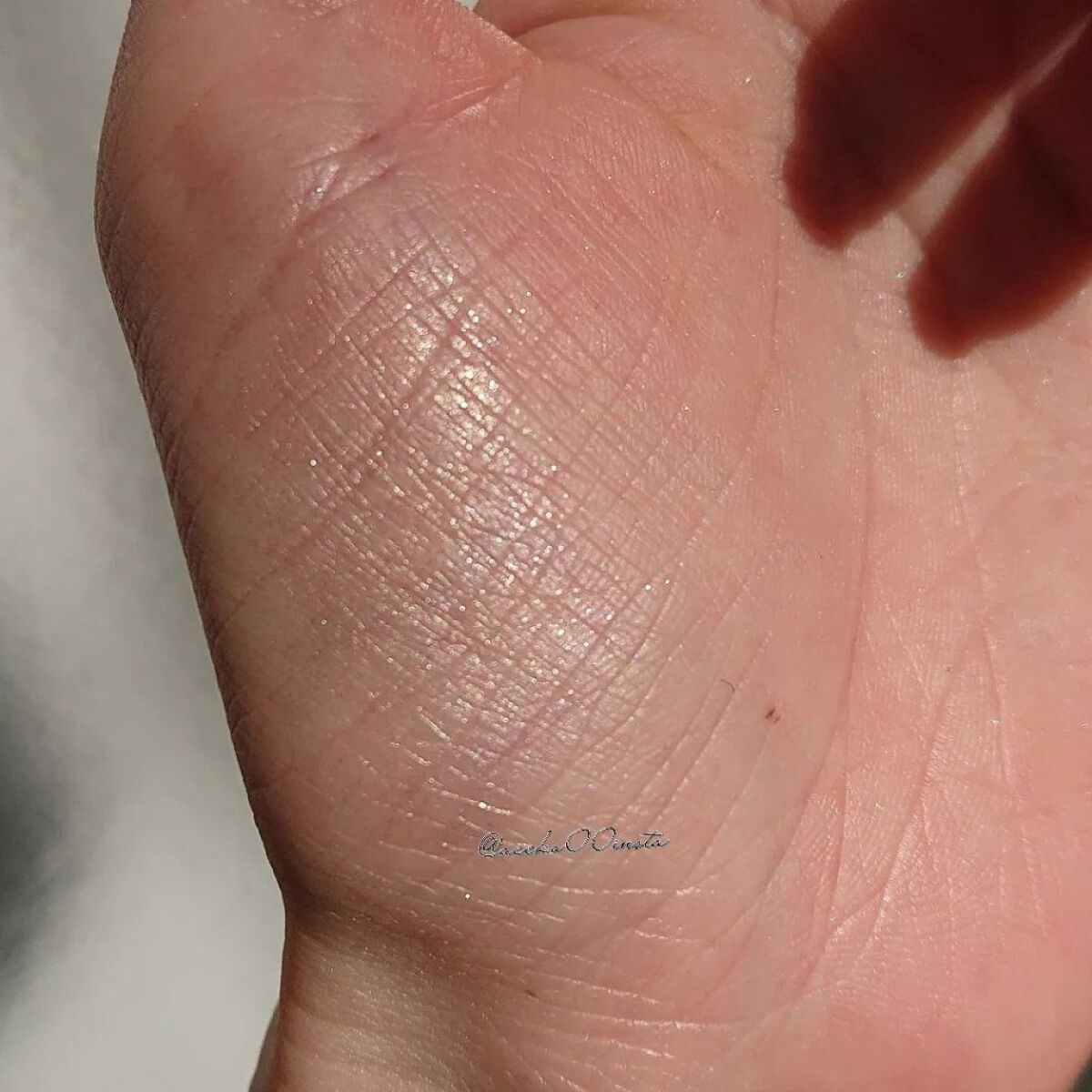 テクスチャーは寒天ベースで出来ており 触るとぷるんっとした質感ですが 塗るとピタッと密着してくれてヨレません!! ほんとピタッと密着するので 塗ったあとは早めにぼかしてあげないと ボカしづらくなりますのでその点は注意です⚠ ・密着度の高さ 寄れないラメが飛ばないずっと留まってるので 永遠とキラキラして可愛いです💠 ・ゴールドラメが細かい&上品なラメで 年齢関係なく使えそう*°♡