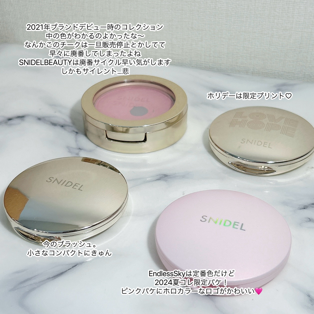2021年春にローンチしたSNIDELBEAUTY全体的に淡いトーンで肌馴染み良く、定番アイテムも限定アイテムも新作が出るたび心躍る大好きなブランドです🩷そんなSNIDELBEAUTYのブラッシュカラーが手元にいくつか集まってきたので並べてみました!廃盤や限定品も含みますが、記録として残しておきます(^^)現在発売中のスキングロウブラッシュもぜひ参考にしていただけたら嬉しいです!・パウダーブラッシュ01CottonCandy廃盤品。ブランドデビューコレクションの一つのチーク。1番のこの白みピンクとっても可愛いのです。優しいツヤもある。ほわ〜っとのせるのが可愛い色白メイクにぴったりこの最初のチークは中が見えるパケなところも便利で好き。チークの使い切りなかなかできていませんがこれは底見えしていてずっと使いたいチークです。・スキングロウヴェールEX02DREAMYGLOW2022年ホリデーコフレ、ネイルポリッシュとアイライナーとセットだったハイライト。これもとっても肌馴染みの良いツヤ。ラメがキラキラ可愛い淡く薄いピンクオレンジ系のきらめきはホリデーのワクワク感もそうだけど、夏の明るさにも良く合う気がします・スキングロウブラッシュ06InnocentBlush日本ブランドのコスメで定番色でこの色って本当に貴重じゃないですか?透明感抜群なアイシーラベンダー。本当に薄く綺麗なベールをかけられる単体でも良いし、ピンク系に重ねても可愛い使い方色々・スキングロウブラッシュ11EndlessSky2024年夏コレクションの新色定番色パケだけ初回限定。パケ全部同じなのでこれは助かるwそしてピンクのパケ、可愛い。パールラメが入った淡いロージーなピンク。可愛い〜無垢だった頃のどこまでも広がった夏の空、みたいなコンセプト(確か)も素敵✨この色は結構発色が良い気がするので、ブラシに取ったら一度手などにとってからのせるとちょうどよいです。どの色も本当綺麗なツヤが出るんだよね〜しばらくは単色チークはこの可愛いコンパクトタイプのブラッシュで行くのかな?ロケットペンダントみたいで可愛くてそこもときめく。チークは使わないという方も、淡くて良いツヤを乗せられるSNIDELBEAUTYのチークなら使いやすいかもしれないです。ぜひチェックしてみてください◎#SNIDELBEAUTY#スキングロウブラッシュ#パウダーブラッシュ#スキングロウヴェール#今月のご機嫌コスメ