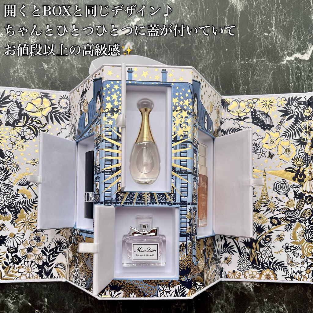 \お得感・高級感満点のミニチュアコフレ/────────────✔︎Diorディオールモンテーニュコフレ¥11.770(オンラインストア価格)────────────【詳細】Diorの代表的なフレグランス・スキンケア・メイクアップのアイコン4製品がミニチュアサイズになった贅沢なコフレ。パリ、モンテーニュ通り30番地に佇むメゾンへと続くガーデン。まばゆい草花の中を蝶や蜂が舞う、華やかで躍動感あふれるミッドナイトブルーの世界をイメージした、高級感溢れるデザイン。Diorの人気製品が楽しめる、数量限定のコフレ。【セット内容】✔︎ミスディオールブルーミングブーケオードゥトワレ 5ml誰もが一度は何処かで見たことのある、Diorのフレグランス。常にフレグランス人気上位に君臨し、長年愛されている名品✨幸せの象徴ピオニーと優美なローズノート。カラブリアンベルガモットのみずみずしい輝きと、ホワイトムスクの繊細なレースにふんわりと包まれたテンダーフローラルの香り。語り継がれるクリスチャン・ディオールの花々への情熱にオマージュを捧げる、可憐なフローラルブーケ。✔︎ジャドールオードゥパルファン5mlDiorが誇るフローラルフレグランス。オーダーメイドの花のように細やかなディテールに至るまで趣向を凝らして創り上げたブーケのよう。イランイランエッセンスとダマスクローズエッセンスが、グラースジャスミンとインド産サンバックジャスミンの希少なデュオと重なり合い、フルーティーで華やかな美しい花束のような香り。✔︎ルージュディオール#999Sサテン(1.5gミニチュアサイズ)クチュールカラーで彩るのアイコンリップスティック、ルージュディオール。レッドピオニーとザクロフラワーをたっぷりと配合した、自然由来のフローラルケア。✔︎プレステージマイクロユイルドローズセラム(プレ美容液)10ml微量要素でキメ密度を整えながら、肌の力を立て直すように。フェイスラインの肌を引き締め、洗練の艶をたたえた、ゆるまない美しさへ導く。────────────ひとつひとつに扉がついた、アドベントカレンダーのまさにミニチュアサイズのようなコフレ。Diorの代表的な製品が4つも手軽に楽しめるお得感、お値段以上の高級感でとってもワクワクします✨ミニチュアサイズなだけで容器の造りは現品とほぼ同じなので、高級感たっぷりなまま。香水は持ち運ぶには重いし、アトマイザーに入れ替えたりしなければならなかったけど、これなら可愛いまま持ち運べるのも嬉しいです!今回のフレグランス2つは初めて使うものですが、どちらも日常使いしやすい清潔感たっぷりな香り。ルージュも気になっていて、全部欲しかったアイテムだったので購入できて本当に良かったと思ったコフレです✨#dior#ディオール#ディオールモンテーニュコフレ#モンテーニュ#コフレ#ルージュディオール#999S#サテン#ジャドールオードゥパルファン#ジャドール#ミスディオールブルーミングブーケ#ミスディオール#フレグランス#プレステージマイクロユイルドローズセラム#プレステージ#dior_香水#dior_美容液#dior_リップ#美容液#デパコス#クリスマスコフレ大公開