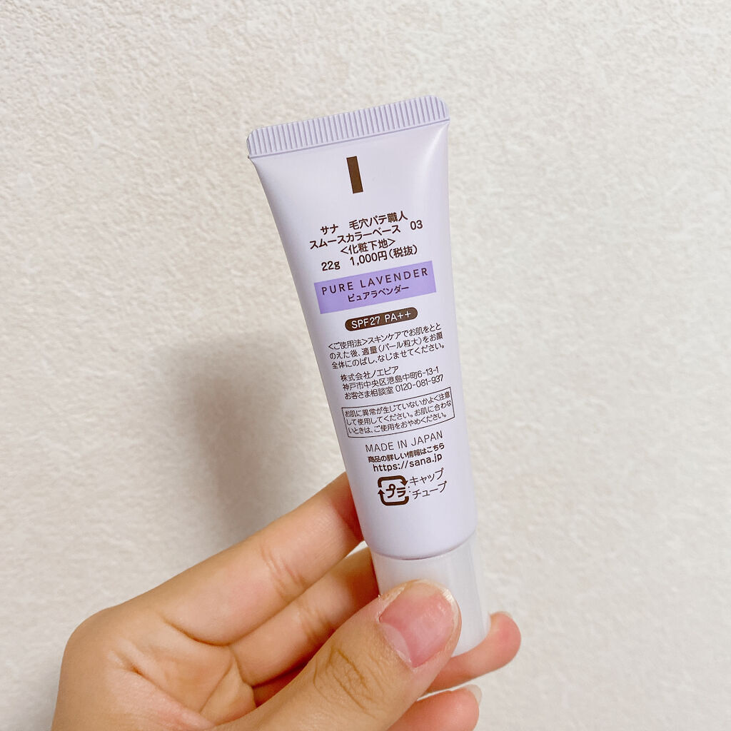・毛穴が埋まってる感じは特に感じない・ピュアラベンダーなのでトーンアップはする・私が持ってるほかの下地よりもいい点があまりない感じはする・悪い所もないので無難ではある・コスパを考えるとリピはない...
