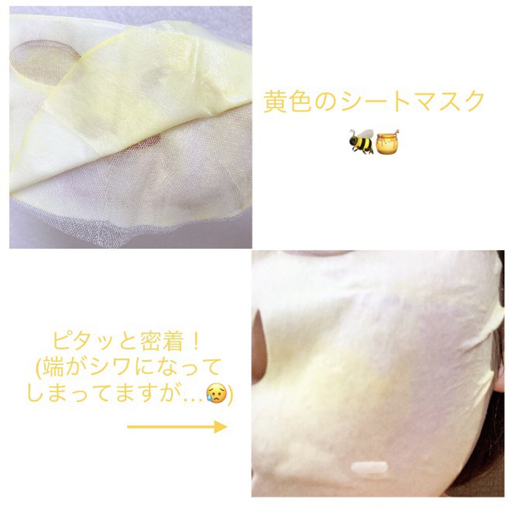 シートマスクに網がついているのがビックリしましたが…その網のおかげで手こずることなくキレイに貼れました❣10分〜20分ぐらい⌛ゆっくり肌に浸透させると✨✨肌に艶が出てふっくらしっとり肌になれて黄色いシートも🍯ハチミツパック🐝〜している感がすごく🐝ﻌﻌﻌ本物の蜂蜜を塗っているかのような🍯気分になれて楽しめました(*´艸`*メイクのりも良かったので💄✌特別な前日に使用したいマスクパックです(*´罒`*)🍯🐝❣