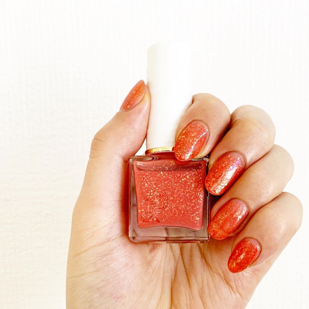 X05:降りそそぐ太陽の光サニーオレンジパステルカラーよりも少し濃いめのオレンジ色に、ゴールドがチラチラしているネイルです。私の場合ははパラドゥのネイルファンデーションRO01をベースに1度塗りして爪の半分から先の部分にフローリックネイルラッ...