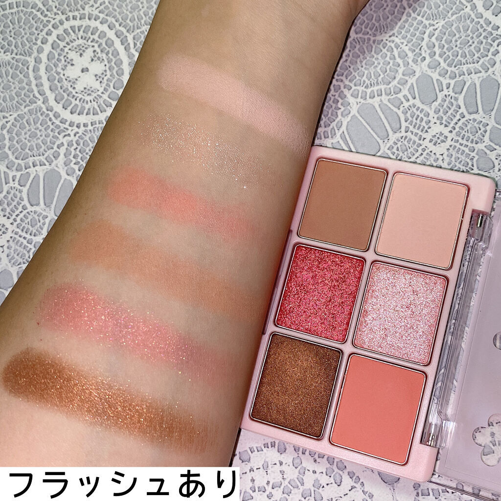 絶妙な6色パレットで上段は甘いストロベリーメイクに🍓下段は甘さの中にもほろ苦さのある大人っぽメイクに ギラギラしている様に見えるラメカラーですがスウォッチしてみると意外に肌に馴染む繊細ラメ! 特に下段中央のお色はピンクメイク好きさんには堪らないラメ感&発色 上段右にはコーラルみの強いピンクもあるためブルベさんイエベさん関係なくピンクメイクを楽しめるのでは無いかと思います☺️✨ マット、ラメ関係なしにサラサラとしたテクスチャで目元の乾燥が気になる場合はアイシャドウベースを仕込むとモチも良くなるためおすすめです👍