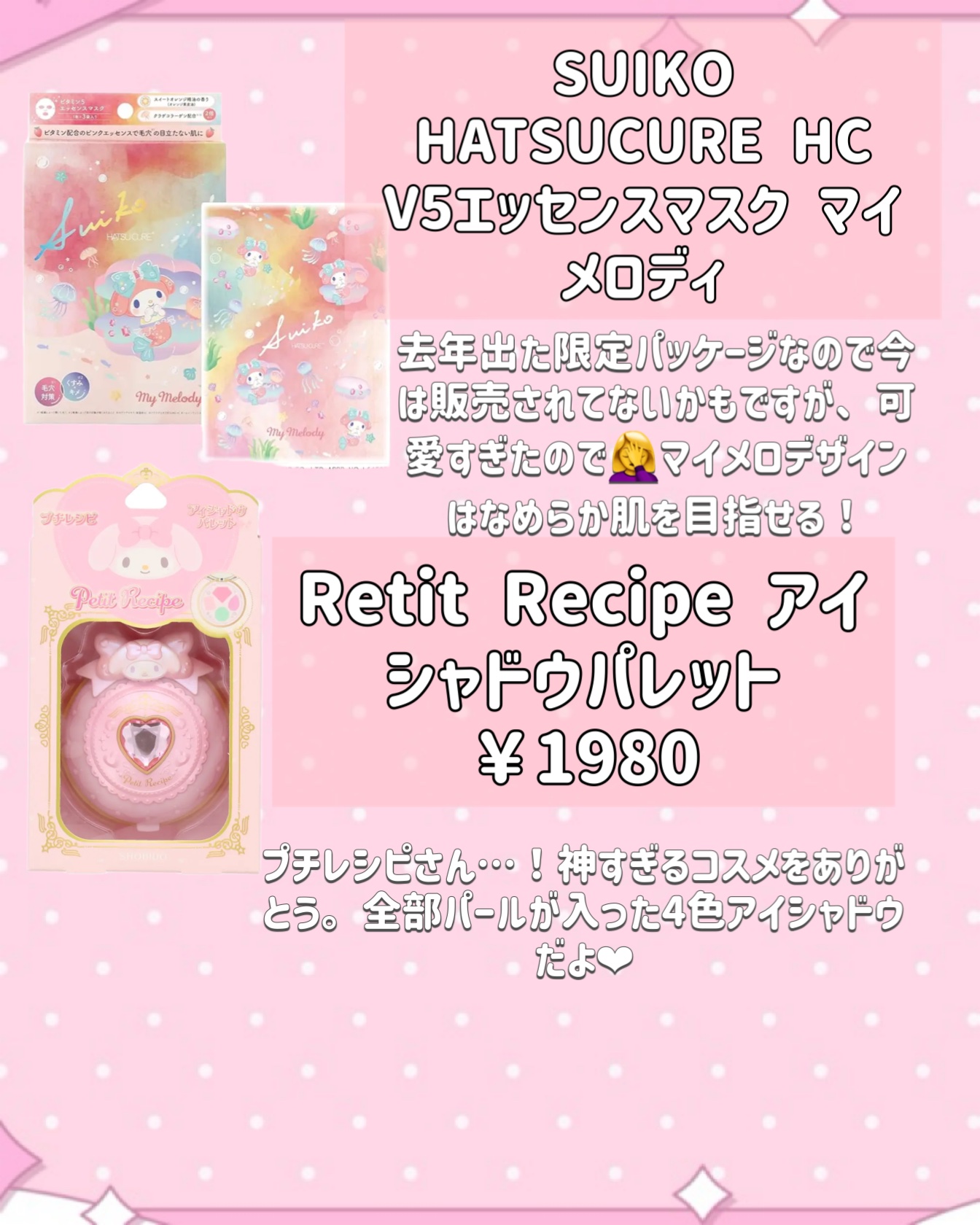 #キャラコスメまとめ🍓マイメロディデザインコスメまとめ🍓今までいろんなコスメとコラボしてきたマイメロちゃん!マイメロコラボのコスメ達はどれもピンクで乙女をくすぐるようなパッケージばかりで心がうきうきしちゃう…❤︎最近はウルリスとコラボしたオイルとシャンプートリートメントが発売されてます❤︎100均にも色々あったよ!!!限定パッケージ多めなので今は発売されてないものも混じってます💦メルカリやAmazonでまだ売ってある可能性があるので良かったら探して見てね💕︎また違うキャラクターでまとめようと思ってます!色違いでもまとめたい🥺※画像はLIPS様よりお借りしました。※イラストはフリーのものを使用しております。#ヘアケア#マイメロ#限定コスメ#サンリオ#パケ買い#ヘアオイル#ハンドクリーム#リップ#バスボム#入浴剤#スキンケア#パック#ハンドジェル#アイシャドウ#ネイル#マニキュア