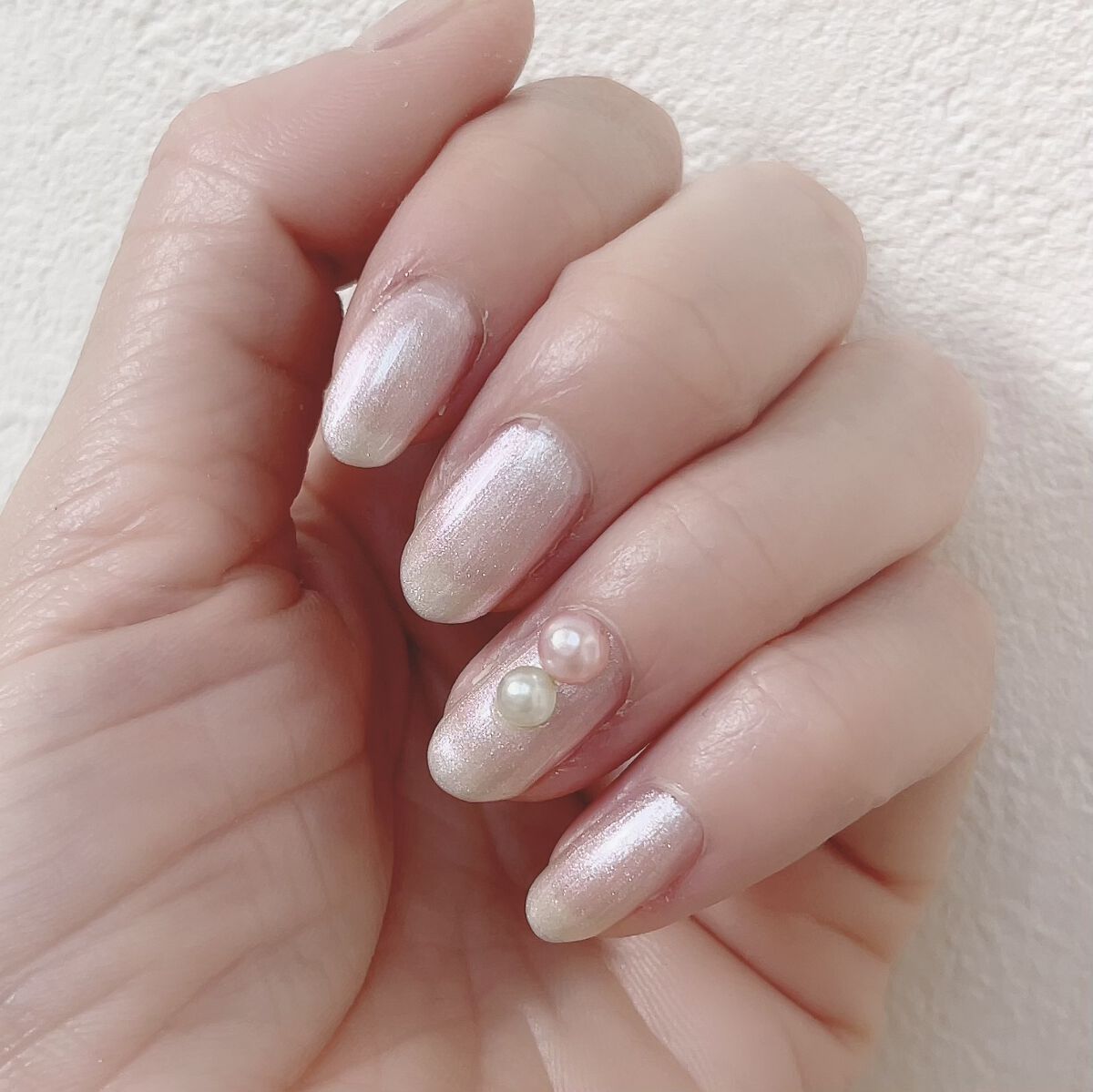 偏光パール入のオパールピンクでとっても綺麗です。 手持ちのネイルに合わせてニュアンスチェンジも出来ちゃいます💅 1度塗りと2度塗りしましたが、1度塗りでもムラ出来ず綺麗✨ 2度塗りの方には、パールのパーツもつけてみました! 綺麗な透明感あるネイルだと思います💎