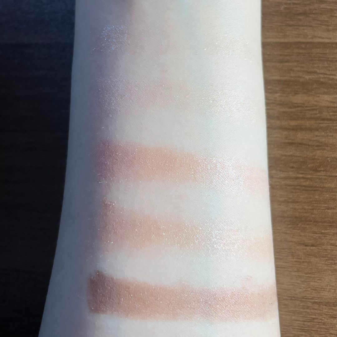 肌なじみがよく場面を問わず使えるアイシャドウです😊 全体的に薄付きなので発色を良くしたい場合はアイシャドウベース必須で✨ 発色が優しめなのでメイクが失敗しにくいカラーだと思います👍🏻 私はお直し用ポーチに入れて持ち歩いていました! 真ん中は多色ラメなところがお気に入り😆 透明感が出ます🫧𓂃𓈒𓏸