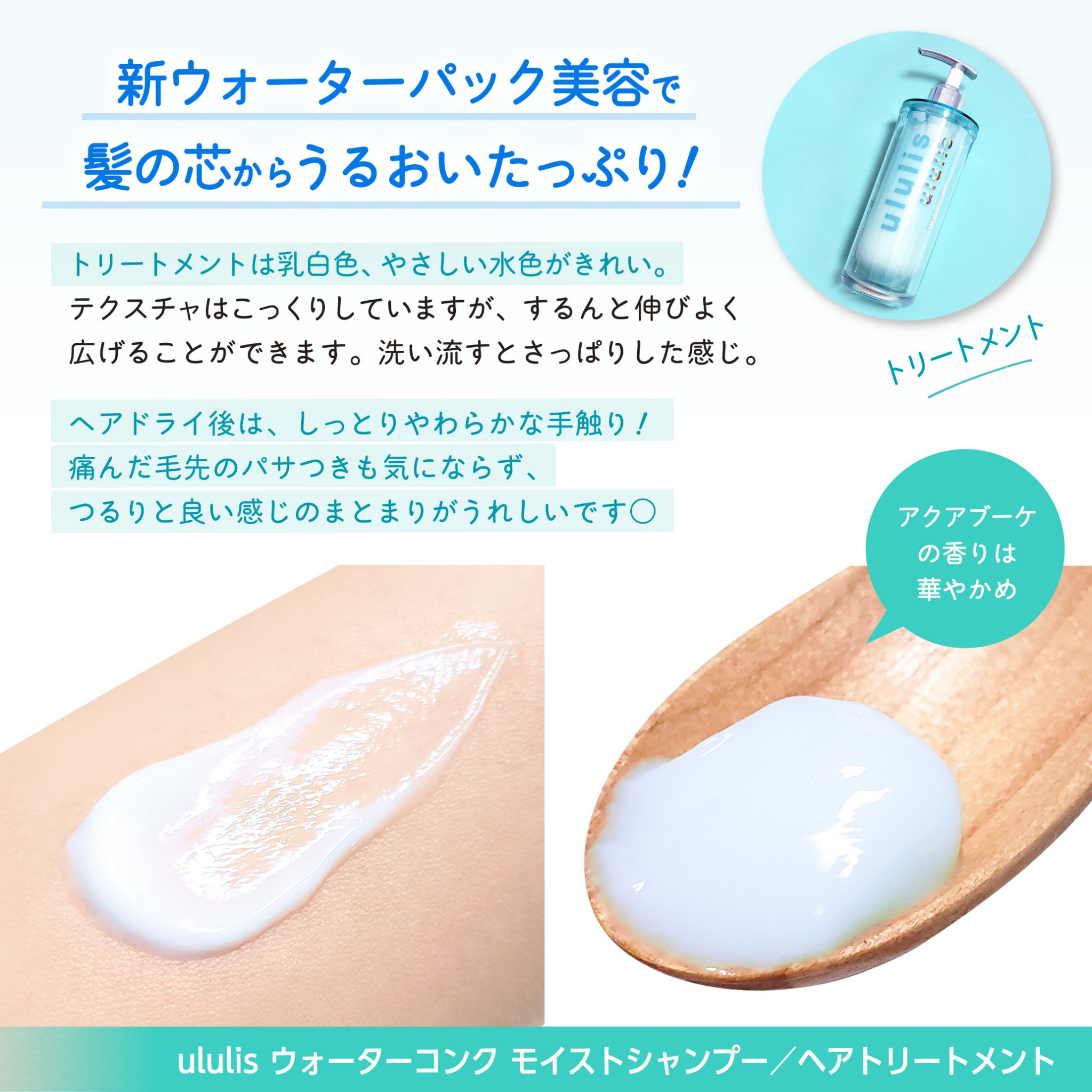 ululisウォーターコンクモイストシャンプー美容水から生まれたMIZUシャンプー&トリートメント。インナードライ髪の水分量に着目し、髪を美容水で包み込む「新ウォーターパック美容」。製品の90%以上を補水+保湿成分で構成。10種の水溶性美容液成分を配合し、髪の芯までうるおいを与えます。サルフェート・パラベン・鉱物油・動物実験フリー処方。スウィートサボンの香り。#ululis#ウォーターコンクモイストシャンプー