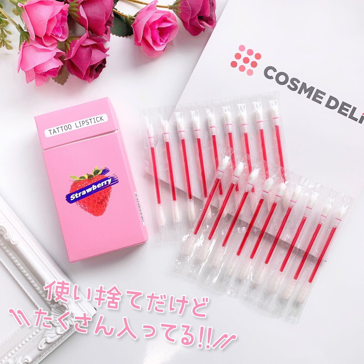お持ちの方もよく見かけるので、ご存知の方もいるかもしれませんが、 綿棒のような形で1本ずつ個包装されていて 衛生的✨そして1度で使い切れるから嬉しい🥰 とにかく可愛い‼️最初は、どこからリップが出てくるか分からなかったのですが、線の部分をポキって折ると綿棒先に染み込むのでビックリしました✨ 色も可愛いし、落ちにくいです✨持ち運べるし、リップの塗り直しにも使えて便利(´-`).。oO(