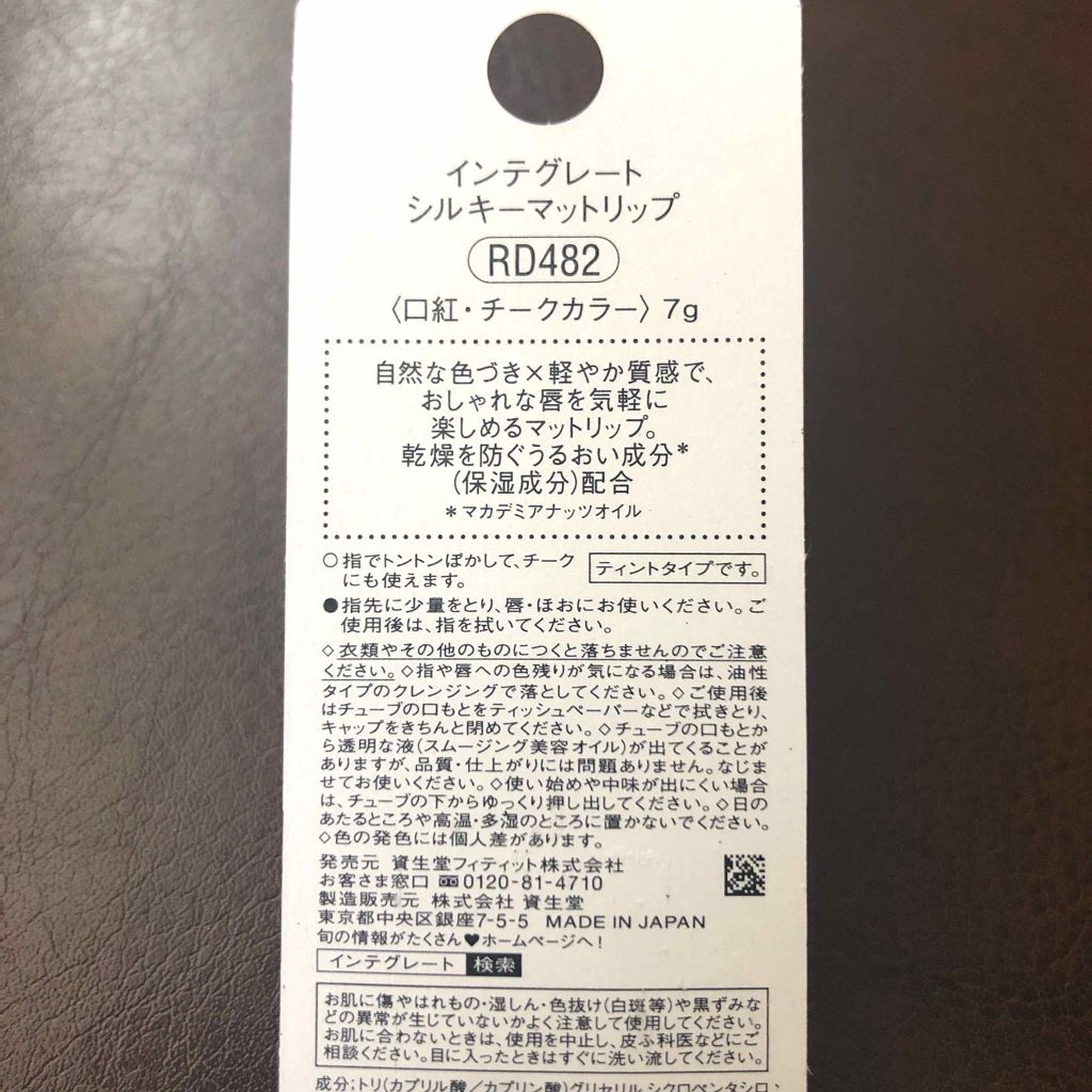 《 INTEGRATE シルキーマットリップRS583 》▶メーカー»»インテグレート▶価格»»7g/¥1,296▶カラー展開»»RS583ホリデーカシス/PK384セイントコーラル/RD482ポインセチアレッド/BR385コニャックブラウン/OR481サンシャインオレンジチークにも使用できるとのことですが、今回のレビューではリップとしての使用感のみを記載しています。〖発色の良さ〗●●●●●カシス/プラム/ワイン系統のカラーで、発色はすごく良いです。この系統の色味が得意な方は、顔色がパッと明るくなり一気にオシャレ感が出ると思います。〖持ちの良さ〗●●●●●質感は変わらず、縦皺に色が沈むこともなく〈つけたての色がそのまま薄くなっていくだけ〉です。色の変化もないので汚くなりません。他のカラーはわかりませんが、購入したRS583は濃いめカラーだからなのか軽く飲み物を飲んだりおしゃべり程度ならつけ直さなくても大丈夫でした◎リップが消えてしまうと一気にメイク後の顔のバランスが悪くなるので〈色残りが強く、色が落ちにくいティント効果〉はかなり嬉しいポイントです。〖つけごこち〗●●●●●リップで荒れやすい唇なのですが、下地に潤いのあるリップクリームを塗ってからこちらのリップを塗り重ねれば全く問題ありませんでした。合わないリップを使用すると、乾燥して皮がパサついて浮いてきたりザラザラすることがあるのですが、こちらのリップでは大丈夫でした。潤いを感じるほどではないけれど、乾燥は感じない不思議なリップです。縦皺が目立ちやすいのが悩みなので、THEマットリップというようなマット過ぎるものだと皺を強調させすぎてしまい苦手なのですが、このリップは皺を目立たせずいい具合に皺に色が入り込んでくれます。〖使いやすさ〗●●◐○○パッケージはコンパクトでポーチにもポケットにも入れやすく、手にも握りやすい大きさです。絵の具のチューブのような可愛い見た目です!発色が良いので、出し過ぎないようにと意識していると慎重になりすぎて慣れるまで時間がかかりました。チューブの先が色移りで汚れやすいです。先端が丸い形状でなく斜めカットだったら、もう少し塗りやすかったかもしれません。濃い色づきが好きな方はそのまま塗っても大丈夫だと思いますが、リップカラーで唇が目立ちすぎるのを好まない方は〈ぼかし必須〉なので、手軽にサッと塗るのは難しいです。鏡ノールック塗りも不可。指塗りはそれなりに手間がかかるので、リップブラシやチップのようなものを持ち歩くと使いやすくなります。塗り方次第で仕上がりを自由に変えられるところはどんな場面でも使いやすいと感じました。〈マットリップの塗ってます感が苦手な方には特にオススメ〉できます。〖 コスパ 〗●●●●●色持ちの良さ/発色の良さのおかげで、一度つけると持ちが良いです◎それ故にそこまで頻繁に塗り直しが必要ではないため、1本使い切るのに時間がかかりそうです。〈ありそうでなかったマット寄りのマットすぎない質感のリップ〉、限定なのが勿体ないです。【個人的な使用感想の余談】唇の上に塗り広げたときの感触と質感が以前投稿したDiorのグロウリップマットラズベリーに似ています。色持ちは同じくらい〜ややインテグレートの方が良いような気もしますし、色展開の豊富さ、価格の安さ、乾燥のしにくさなどトータルでインテグレートの方が良いと思いました。Diorの方は、塗りやすさがインテグレートを上回っていました。それぞれの商品は別物であり、どちらにも良さがあります。〖リピの有無〗●●●●●色も持ちの良さも質感も気に入りましたが、それらのメリットが多い分、減りが遅そうなのでなかなかなくならない気がします。限定品なので使い切る頃にはもう売っていないだろうし、その点は残念です。❖良かったところ❖・少量で充分色がつき、持ちも良いので1本で長持ちしそうなところ(これで¥1,296なら安い!)・マットすぎる仕上がりに抵抗がある人でも使えるようなセミマット感・ぼかし方次第で仕上がりが自由自在❖残念だったところ❖・プチプララインでは他にはないような商品なのに限定販売なところ・リップの先端が汚れやすい構造▶使い方のコツ発色がいいのでつけすぎに注意が必要です。濃い色のリップに抵抗のある方は、特に少量をつけて指でポンポンとぼかすor唇の上でブラシを使って色を広げて薄めながら塗る塗り方がおすすめです。がっつり色をぼかさずにつけたい方は、ブラシで輪郭を縁取り、唇の中を色で埋めていく塗り方が良いと思います。▶こんな方にオススメ!✓乾燥しにくいマットリップを探している方✓ティントタイプのしっかり色が定着するマットリップを探している方✓ツヤはほとんどなく、マット寄りだけどマットすぎないマットリップを探している方✓普段メイク直しが出来ない環境が多く、色が唇にしっかり残るリップを探している方#インテグレート#シルキーマットリップ#マットリップ