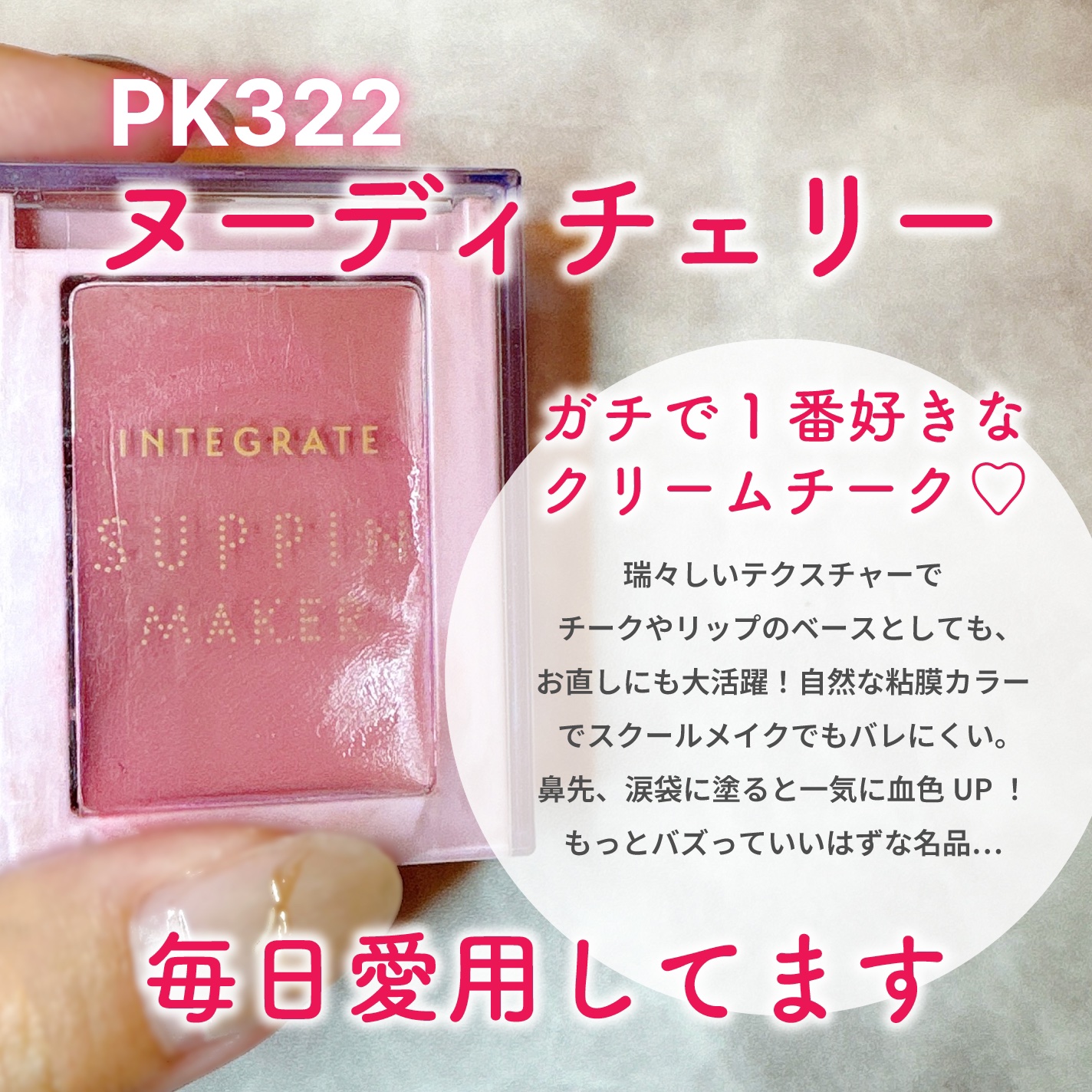 こんばんは。今日はインテグレートのすっぴんメイカーチーク&リップ、PK322をご紹介します♡わたしはチークとしてのみ使っているのですが、「すっぴんメイカー」という名前の通りじゅわっと柔らかなピンク色のほっぺが作れます。普段パウダーばかり使うの...