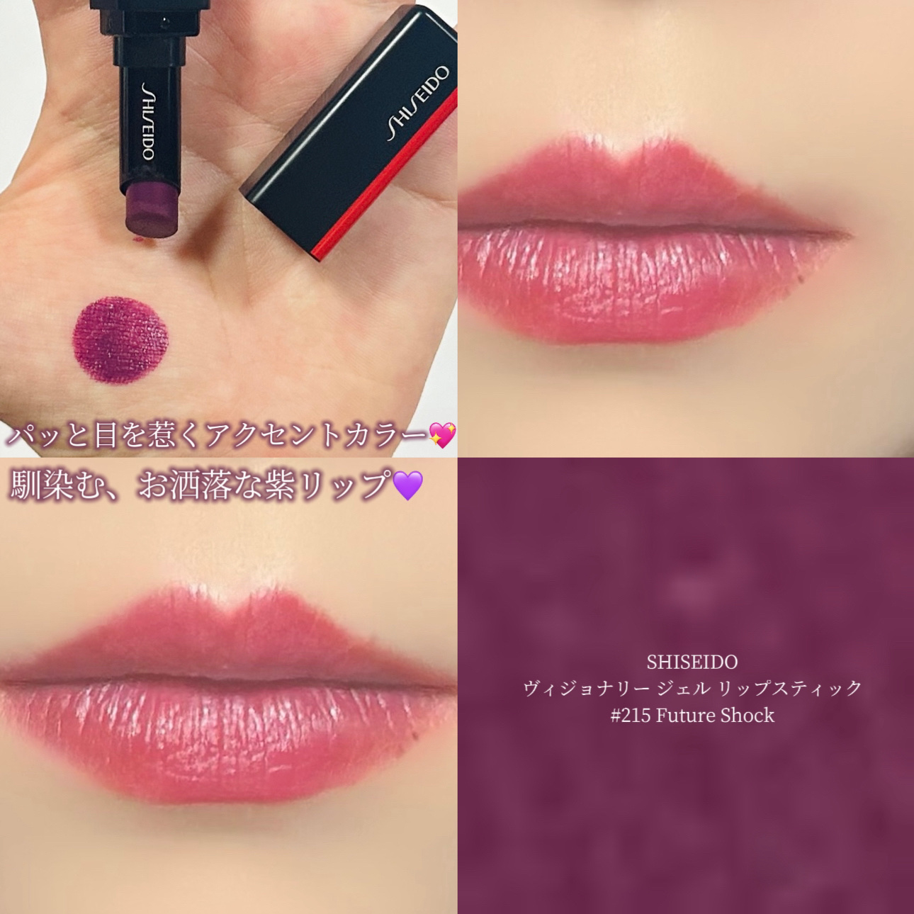 深みのあるパープルリップ🍇/────────────♡SHISEIDOヴィジョナリージェルリップスティック 215 FutureShock¥3,960────────────手に出してみると、ザ・紫!みたいなさつまいもみたいな鮮やかなカラーだけど、実際唇に塗ってみると案外馴染んで綺麗なカラーに🫰🏻ブルベ冬さんにおすすめしたい深みのあるカラーです💜パキッとした発色だからいつもより肌が明るく見えるのも嬉しいポイント❣️普通のリップスティックだから色持ちは良くないけど、軽いつけ心地で程よいしっとり感🫧ぜひチェックしてみてね💫#SHISEIDO#資生堂 #ヴィジョナリージェルリップスティック#紫リップ #パープルリップ #モーヴピンク #モーヴリップ #デパコス #デパコスリップ#推しマットで洒落感UP