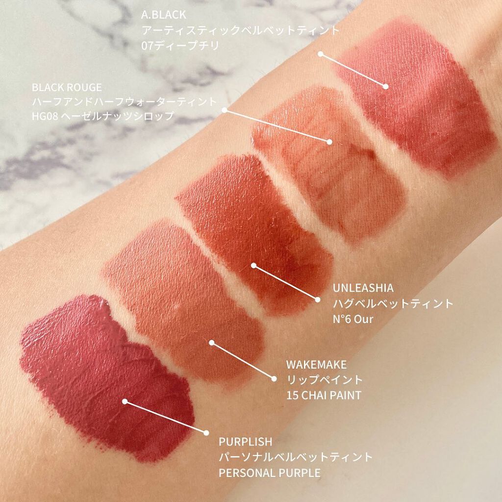最近はマットでも乾燥しづらいものがたくさん発売されているのでマットが苦手な人もぜひ一度チャレンジしてみてくださいね! アーティスティックベルベットティント 07ディープチリ HALF&HALF WATER TINT 2 HG08 ヘーゼルナッツシロップ ハグベルベットティント N°6 Our リップペイント 15 CHAI PAINT パーソナルベルベットティント PERSONAL PURPLE